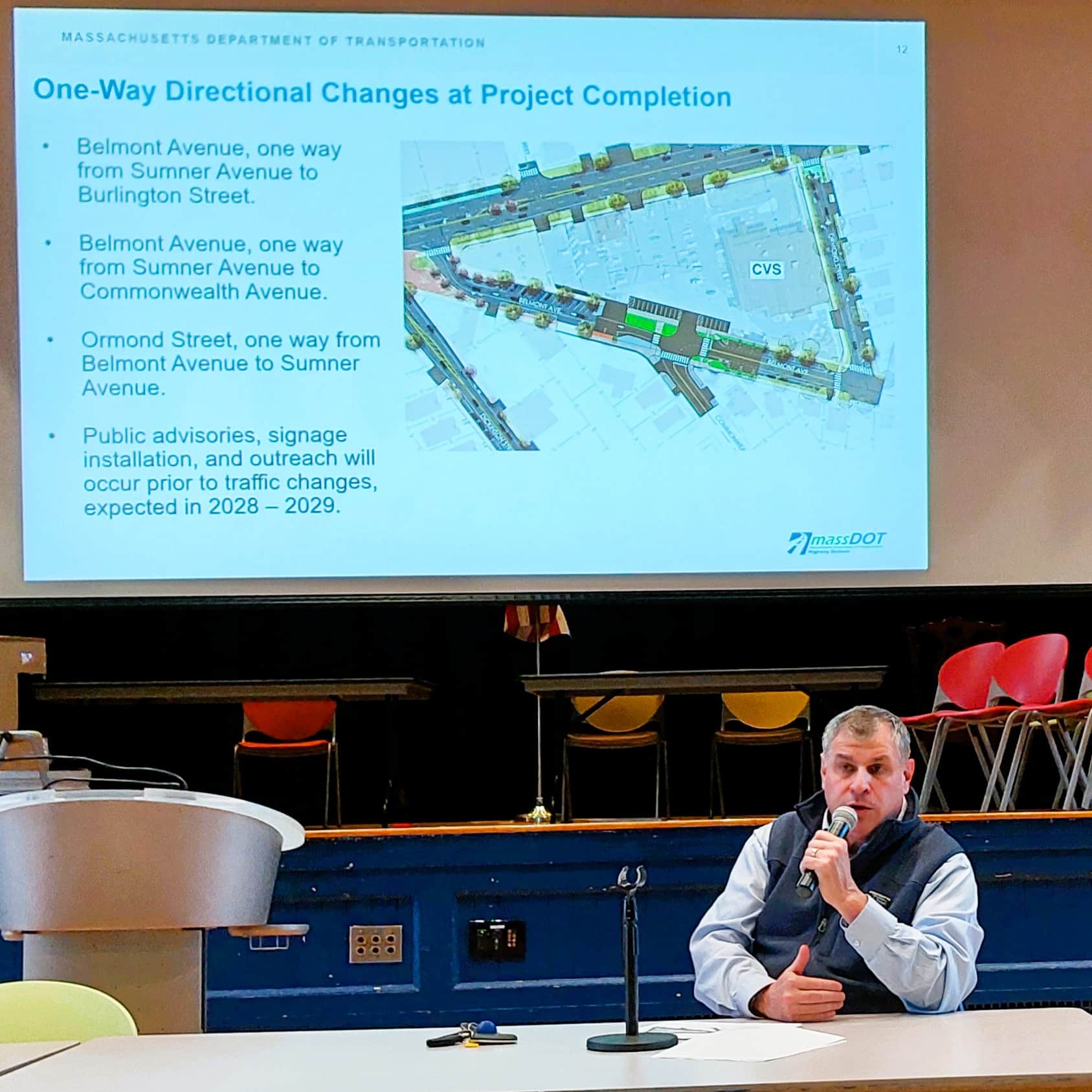 Among these are plans to change the streets leading in and out of the X to one-ways. Cignoli explained that traffic entering the X from Belmont will need to turn onto Ormond — a one-way — and make a left turn. Vehicles exiting the X to travel toward East Longmeadow will turn onto Belmont, which will be a one-way between Sumner and Commonwealth. A similar pattern will play out on the opposite side of Belmont, which will be a one-way route from Burlington to Sumner. The traffic pattern changes will not go into effect until 2028 or 2029, and there will be public advisories and signage prior to the changes.