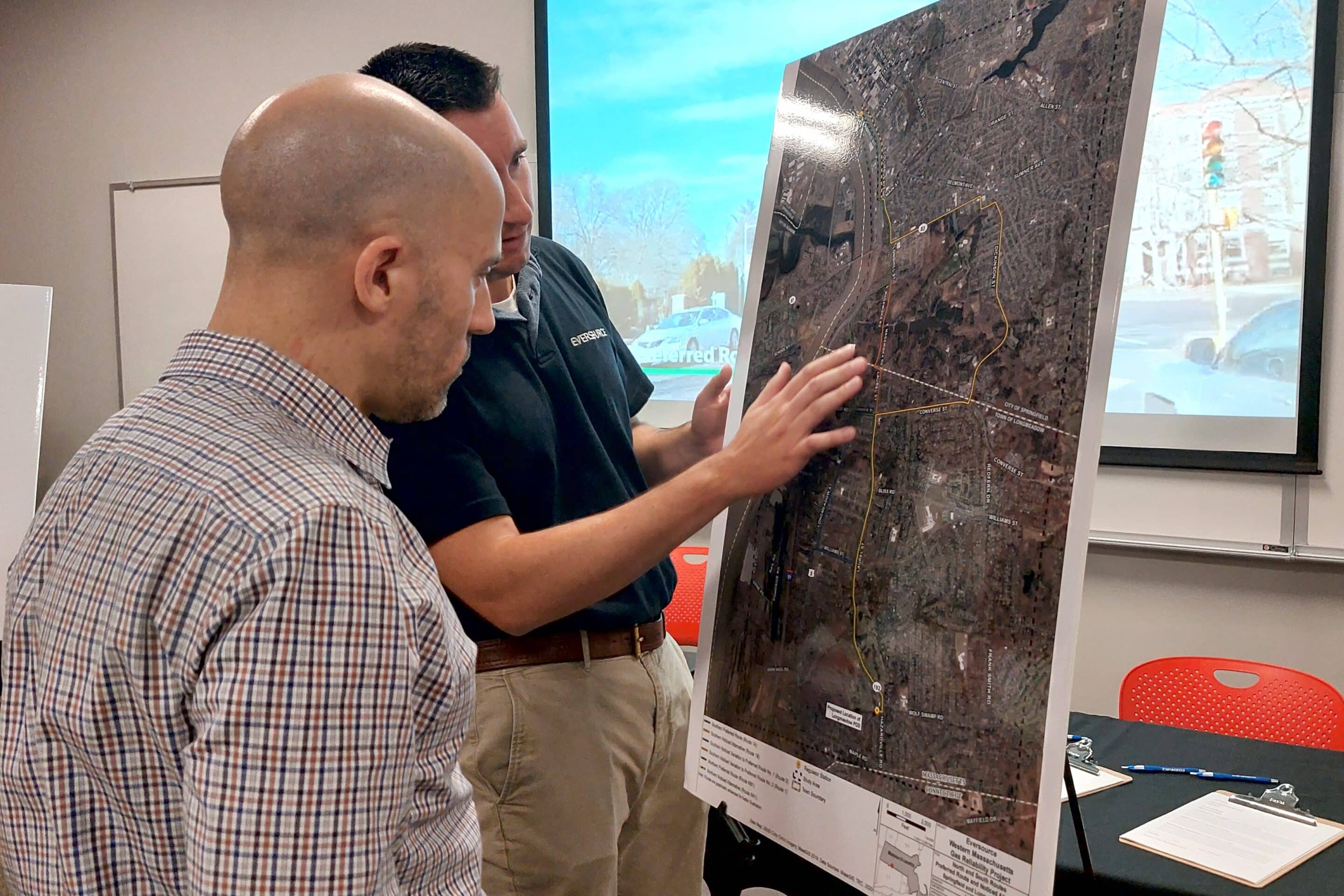 Eversource’s Richard Salarezza shows Springfield resident Juan Latorre the potential routes for the pipeline.