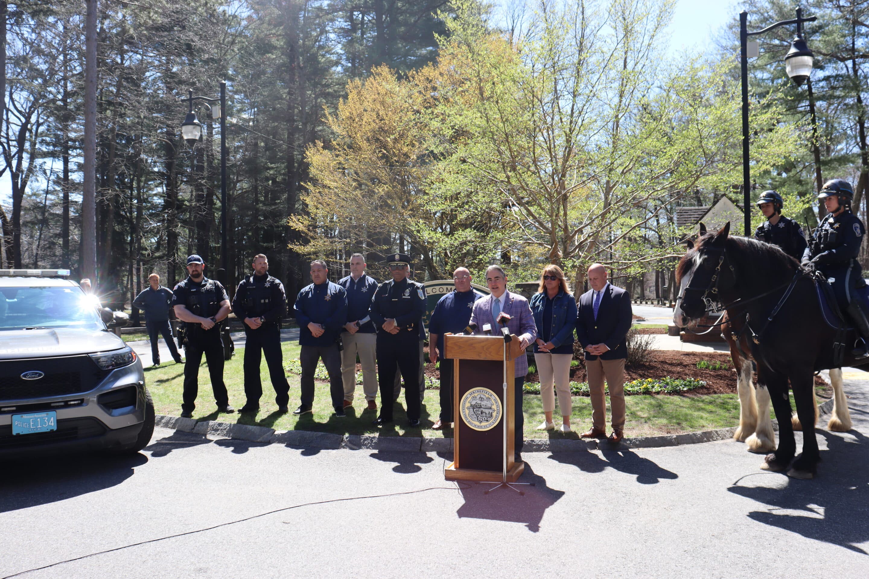 Patrols in Forest Park by Hampden County Sheriff’s Deputies will increase this summer following an April 16 announcement by city of Springfield and Hampden County officials. Mayor Domenic Sarno announces the increase in Forest Park patrols with Hampden County Sheriff Nick Cocchi, Police Superintendent Lawrence Akers, Park Commissioner Jennifer McQuade and Director of Parks, Recreation and Facilities Thomas Ashe at Forest Park on April 16.