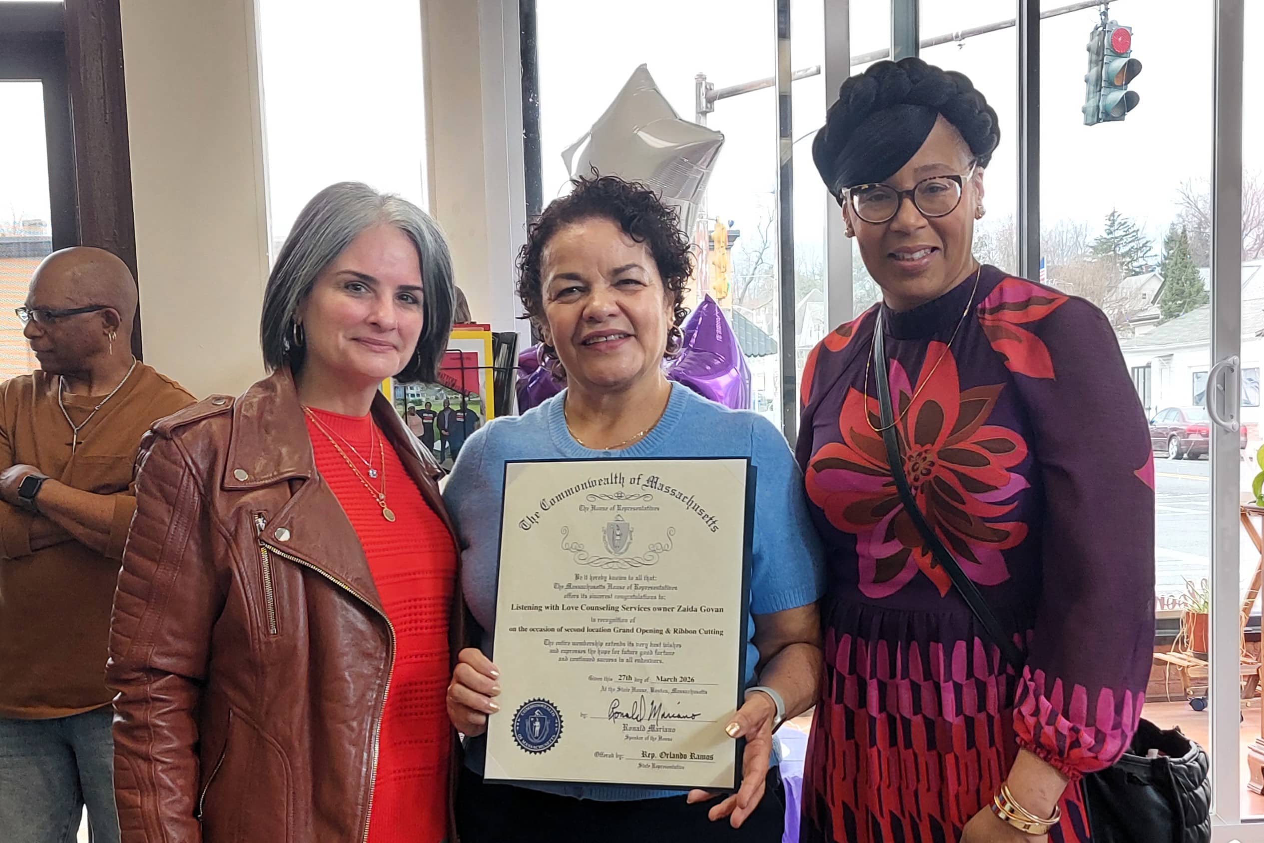 At the grand opening of Listening With Love’s new space on March 27, City Council President Tracye Whitfield delivered two proclamations. In reading the City Council’s proclamation, she quoted Dr. Cornell West, who said, “Justice is what love looks like in public.” Whitfield further spoke about how Govan, who is also the Ward 8 City Councilor, has worked to support Springfield residents, particularly those in Indian Orchard. She also shared that Govan helped her become comfortable with seeking a therapist.