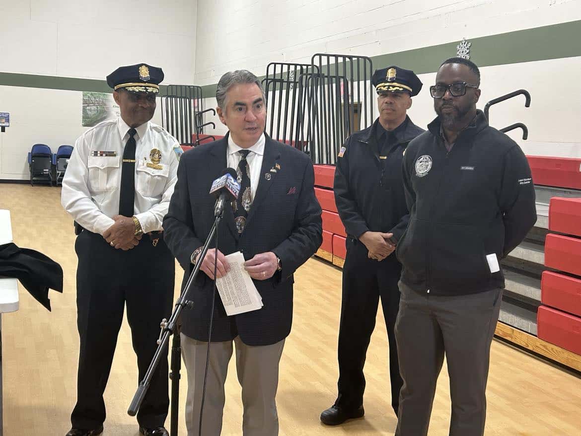Springfield Mayor Domenic Sarno joined local police officers, Holyoke Mayor Joshua Garcia, Chicopee Mayor John Vieau and Hampden County Sheriff Nick Cocchi on the Springfield City Hall steps to announce a “coordinated effort” to stop what Sarno says are “marauders” putting themselves and the community at harm.