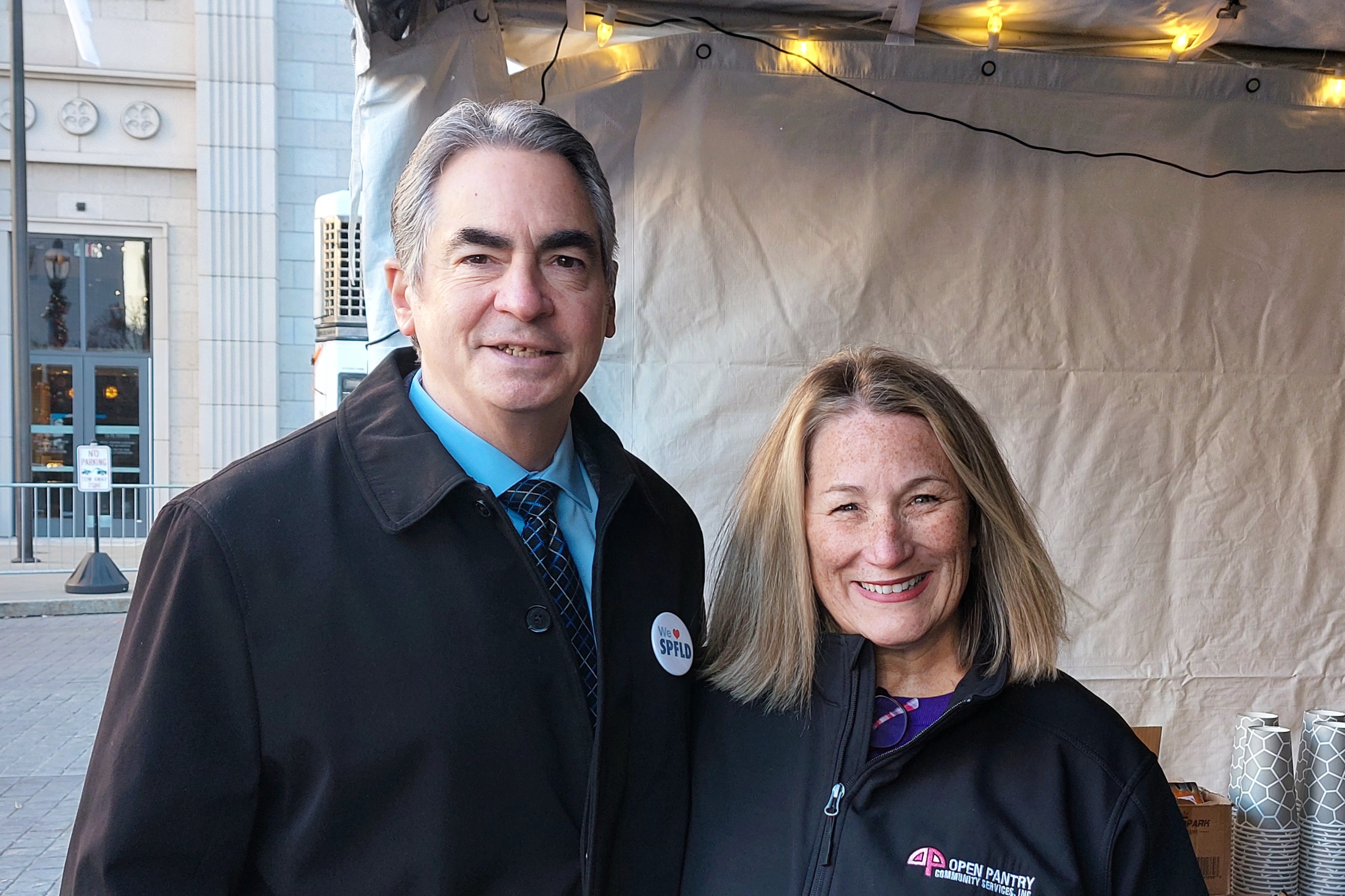 Springfield Mayor Domenic Sarno stopped by to urge people to donate and take a photo with Open Pantry Agency Director Nicole Lussier.