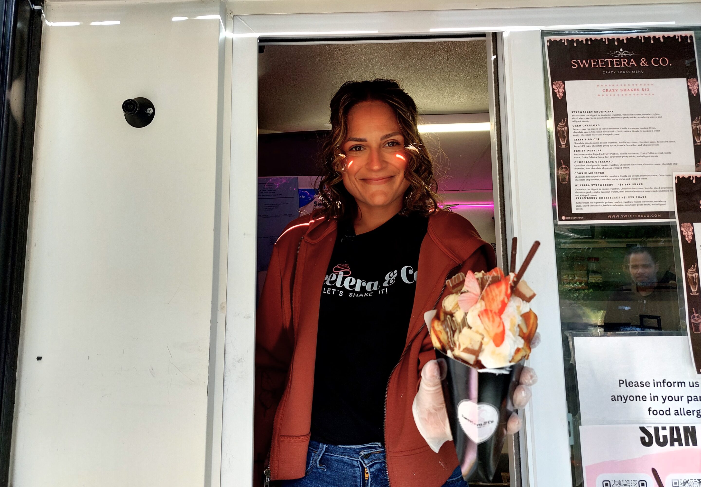 Natalie Mercado hands out a bubble waffle ice cream creation at the Sweetera & Co. food truck.