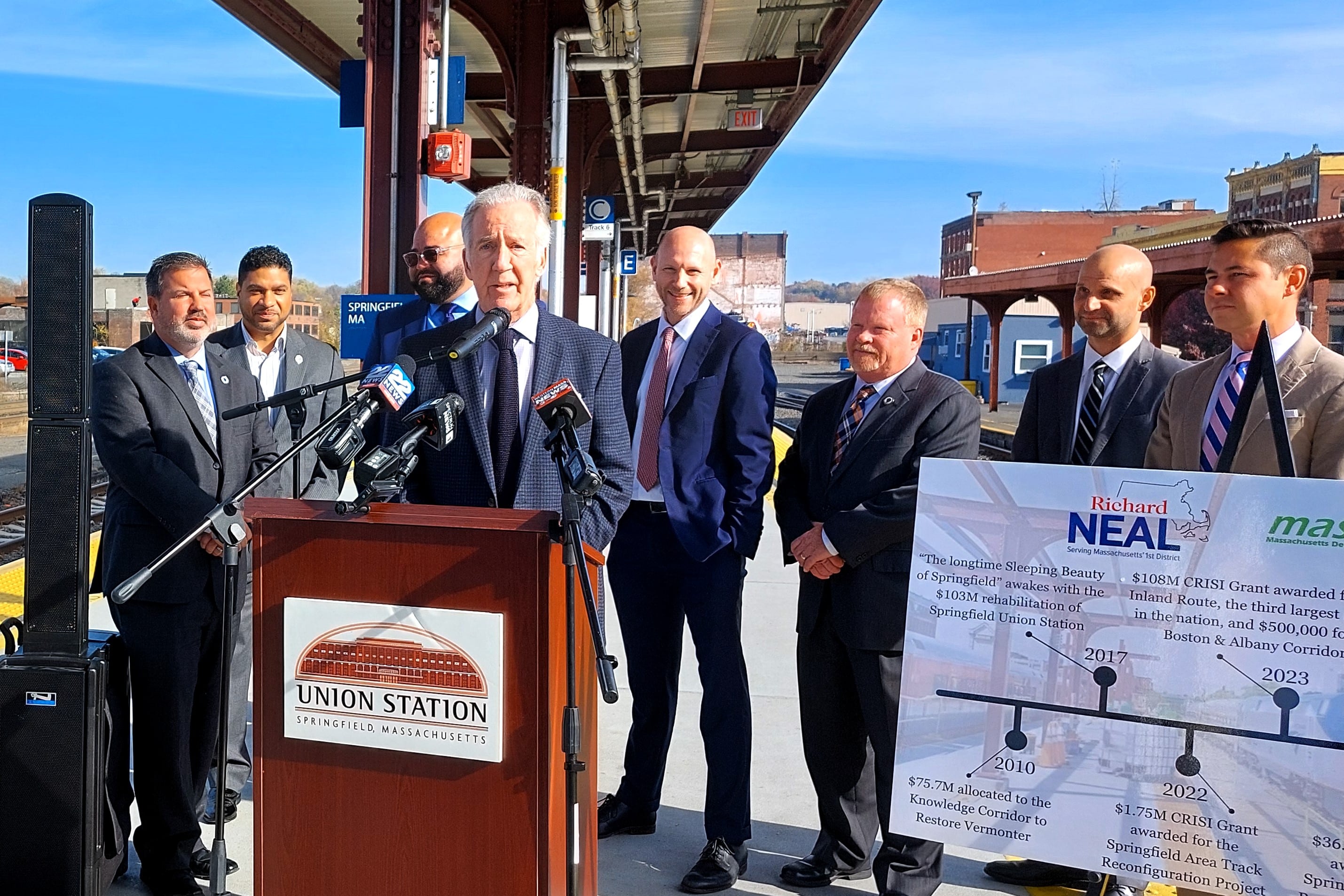 U.S. Rep. Richard Neal, surrounded by state Reps. Aaron Saunders, Orlando Ramos and Kelly Pease, state Sens. Adam Gomez and Jake Oliveira, Director of Federal Funds and Infrastructure Quentin Palfrey and Massachusetts Department of Transportation West-East Rail Director Andy Koziol, announces $36.8 million for Springfield track reconfiguration as part of East-West Rail.