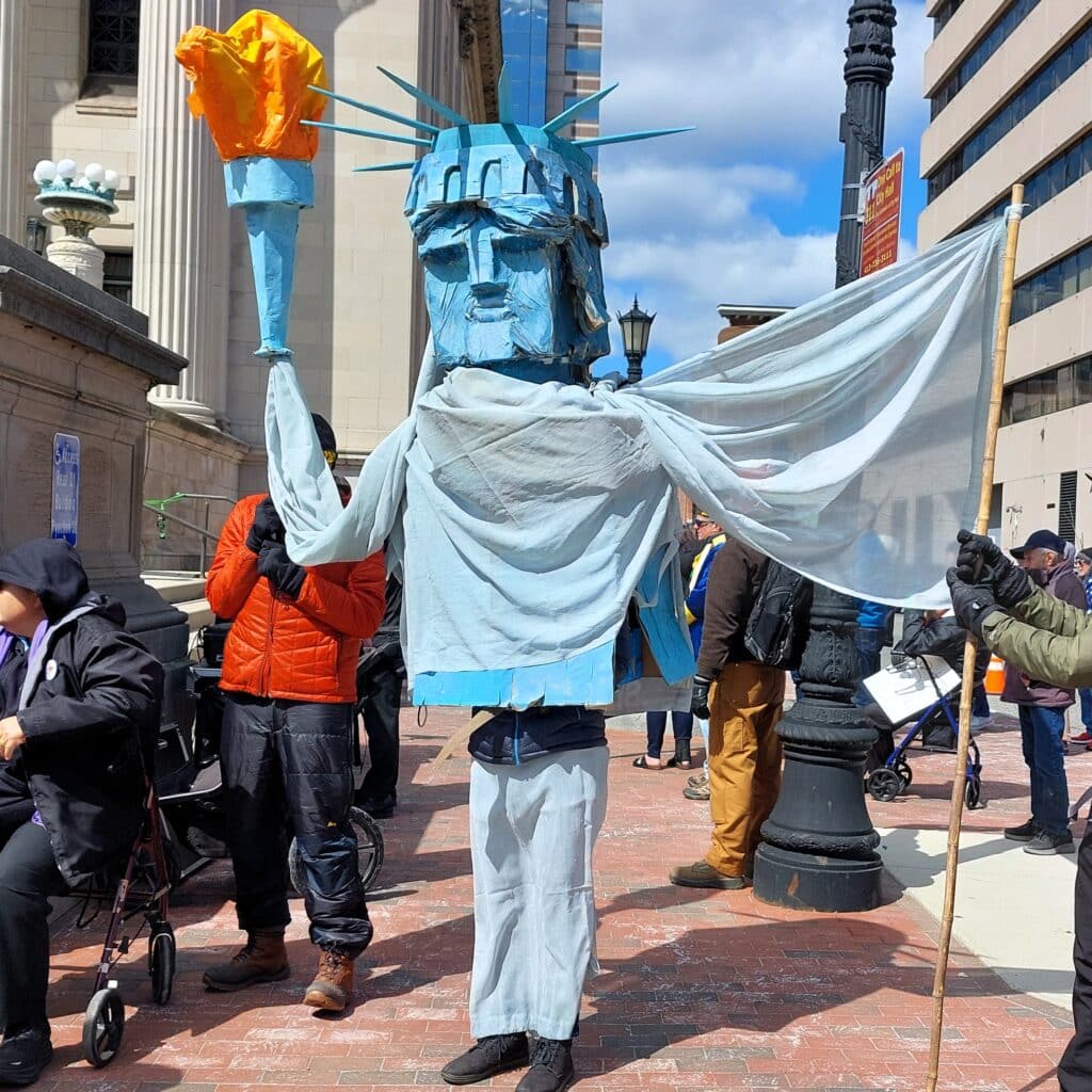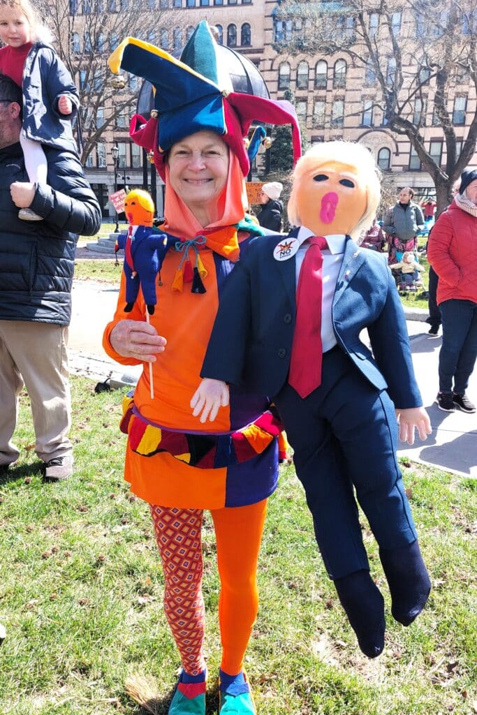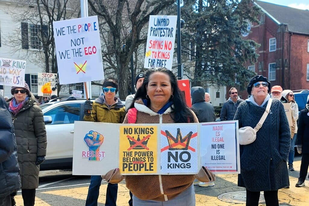 When asked if displays like the No Kings protests have an impact, Donna “Dee” Fellows, an organizer with Defending Democracy in Hampden County, said, “That’s a really good question. I think it has an impact for creating energy for the people who are fighting for democracy. It just shows that there’s other people as well as them, so it just gives them the feeling of being involved and having people who support with them.”
