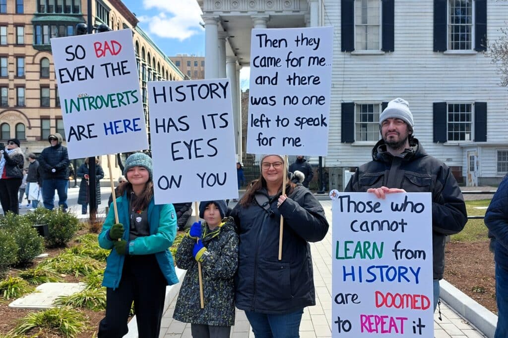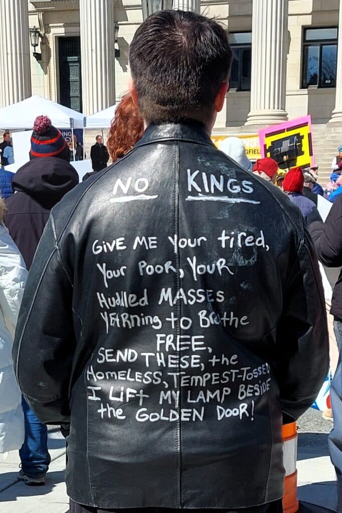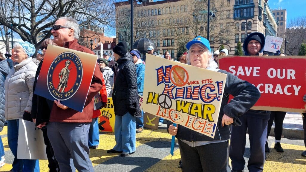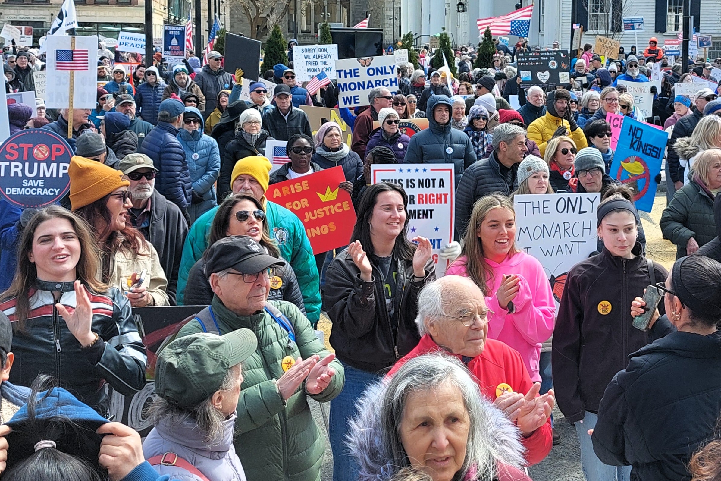SPRINGFIELD — About 1,000 people, bundled up against the cold, stood shoulder-to-shoulder in Court Square, with colorful signs lifted overhead that read “No Kings,” and “Defend Democracy.”