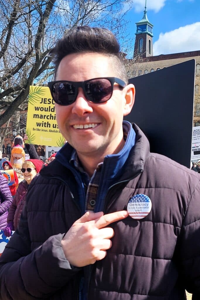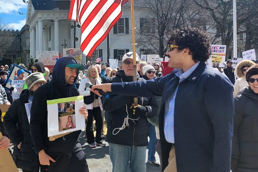 State Sen. Jake Oliviera stood in the crowd, wearing a pin that read, “Democracy is not a spectator’s sport.” Referring to a protest of Immigration and Customs Enforcement’s tactics that he attended on the steps of City Hall a month before, he said, “Last time we were here, Iran hadn’t even happened. We were here protesting the way our country was less safe. Now, the world is less safe. It’s just getting worse and worse.”