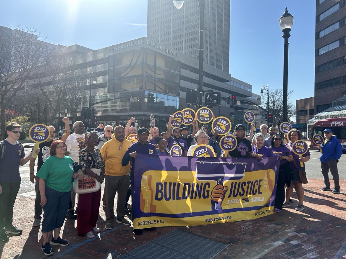 Union members from 32BJ SEIU gathered outside One Monarch Place in Springfield to protest the likely displacement of 14 longtime union cleaners by a nonunion cleaning contractor.