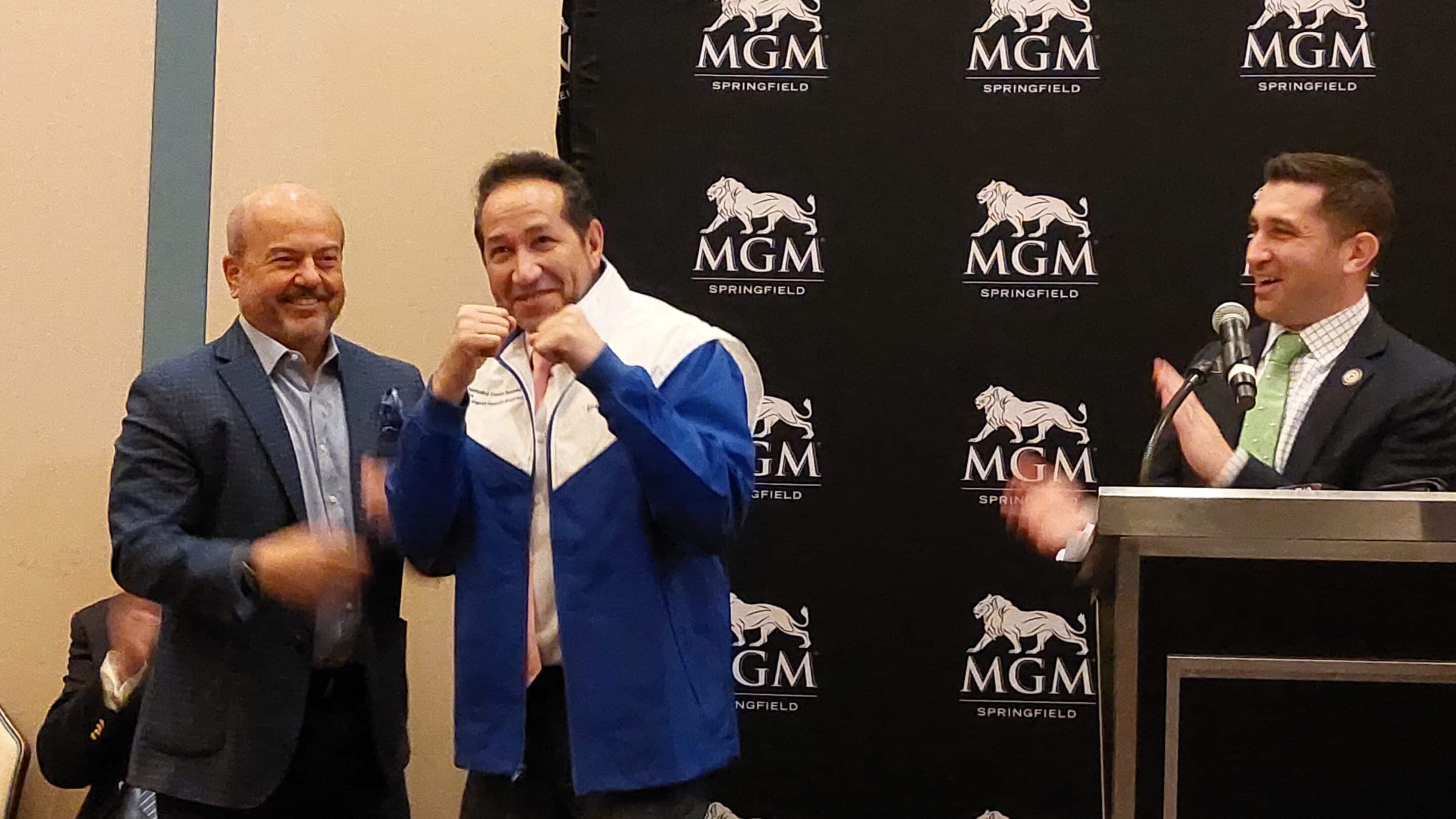 Gulluni and MGM Springfield President Louis Theros presented Gonzalez with the embroidered blue-and-white jacket worn by the honorary chair.