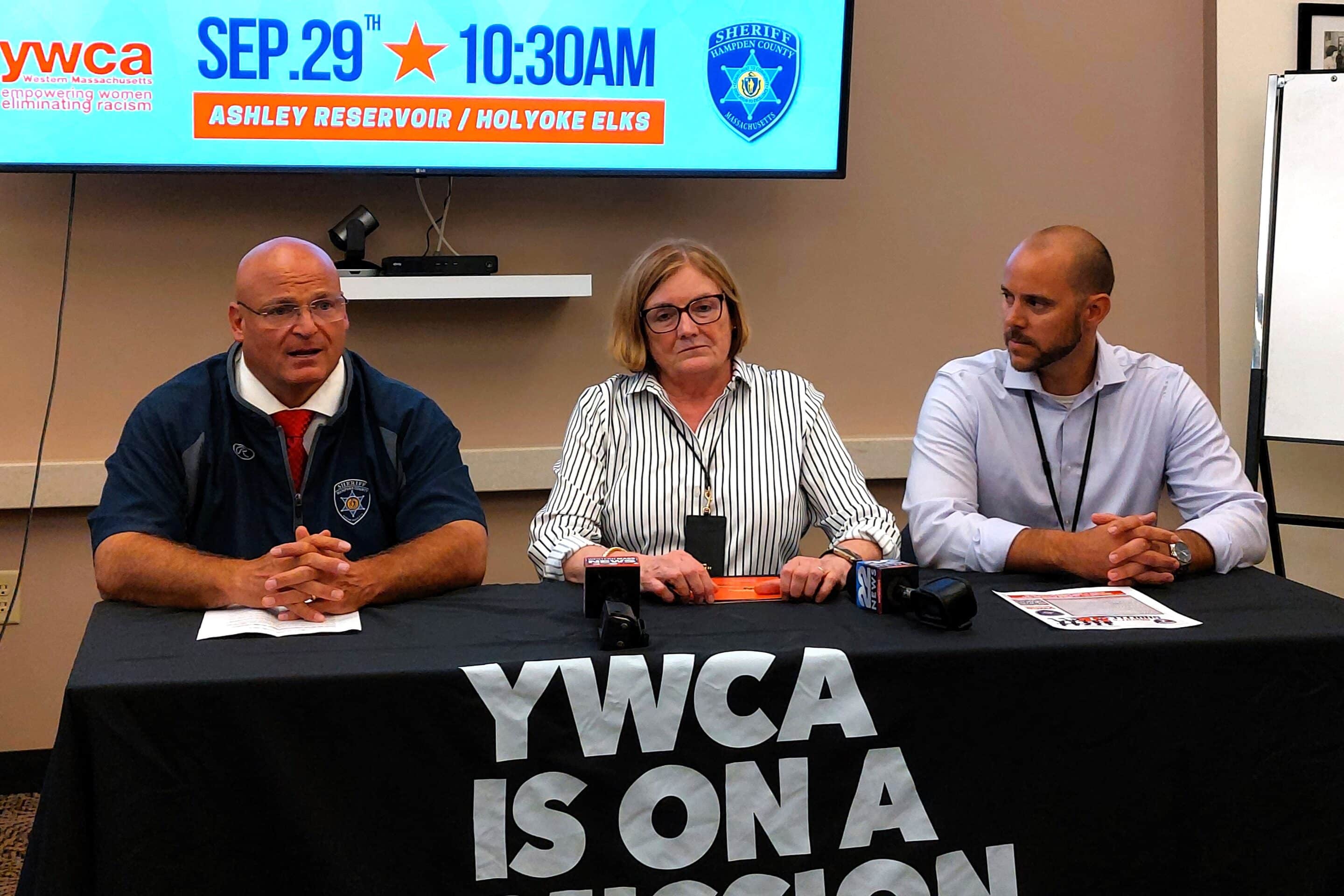 Hampden County Sheriff Nick Cocchi, YWCA of Western Massachusetts CEO Elizabeth Dineen and Sheriff’s Shuffle Race Director Davis Snow speak about the increase in domestic violence.