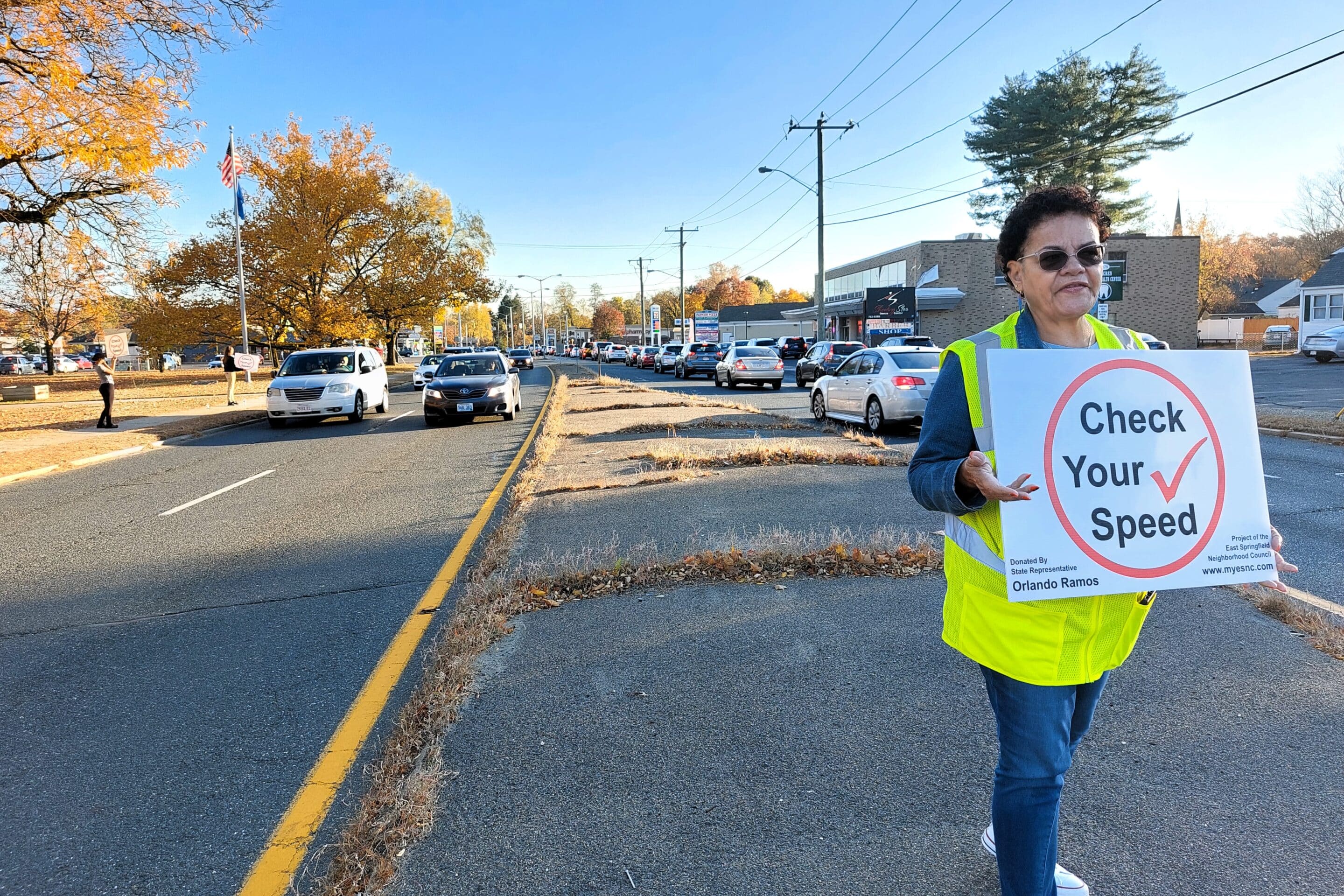 Springfield City Councilor Zaida Govan stands on the median at a busy stretch of Parker Street urging motorists to slow down.