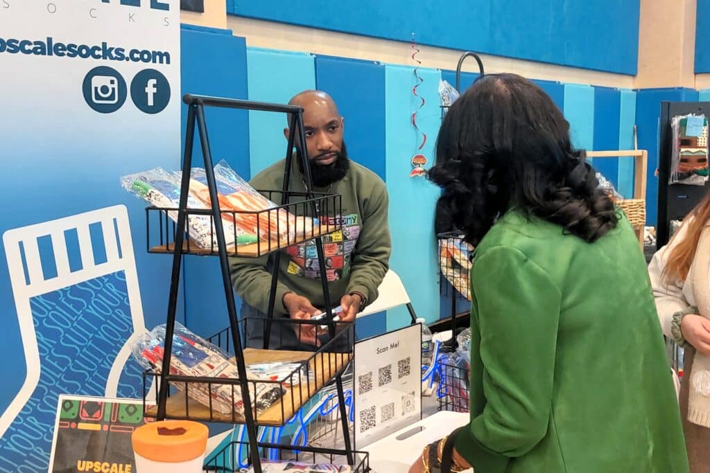 Lenny Underwood, owner of Upscale Socks, shows his products at the Black History Celebration. Reminder Publishing photo by Sarah Heinonen