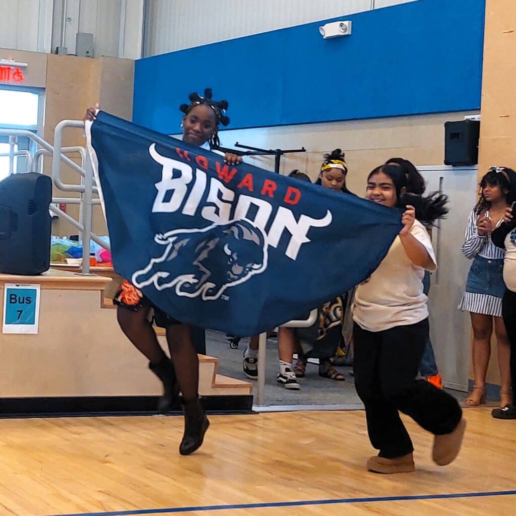 Students show off flags for local colleges and historically Black colleges and universities. Here two people carry the flag for Howard University. Reminder Publishing photo by Sarah Heinonen