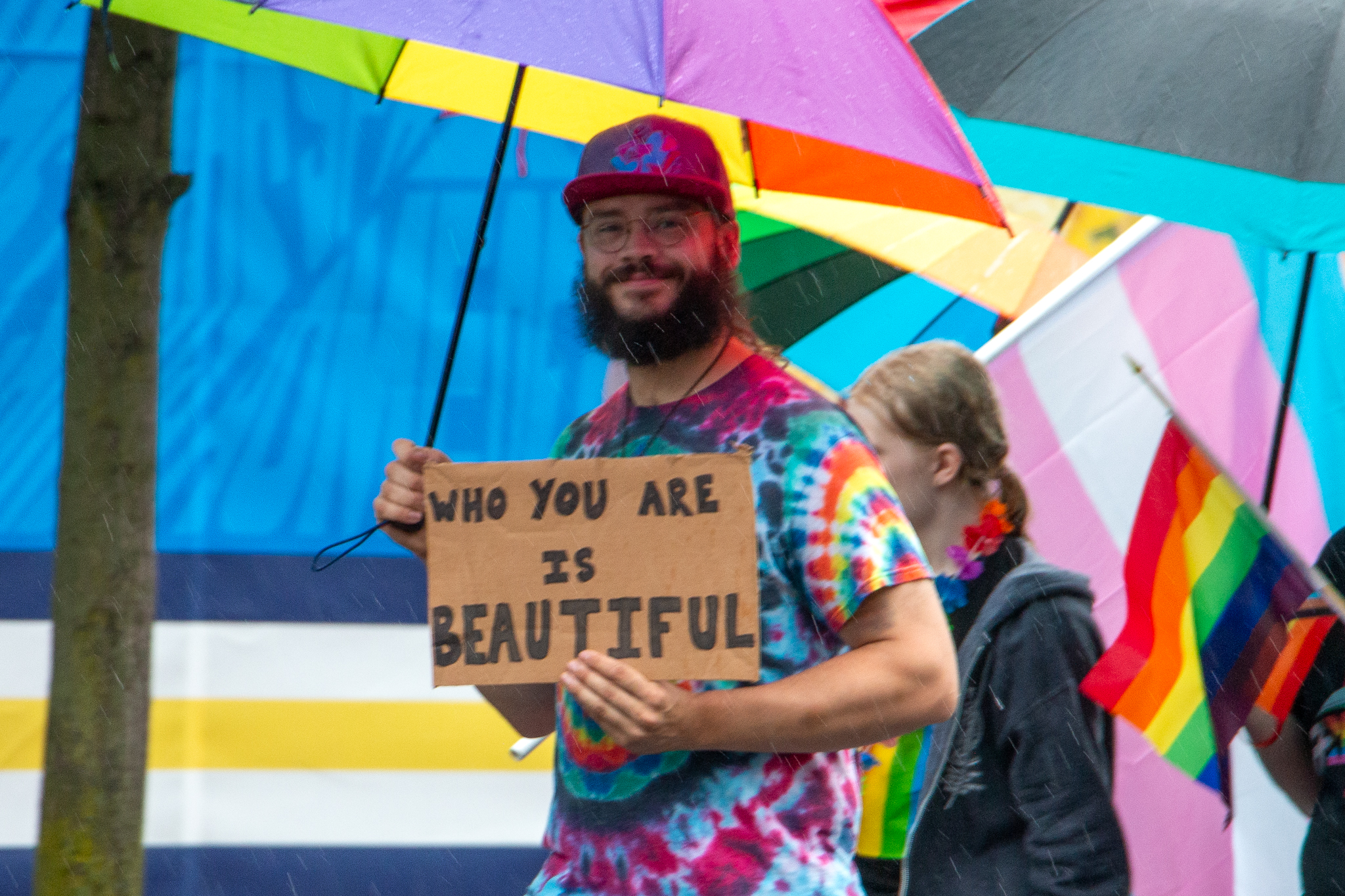 A parade goer holds up a sign that says “Who you are is beautiful” at the fourth annual Pride Parade.