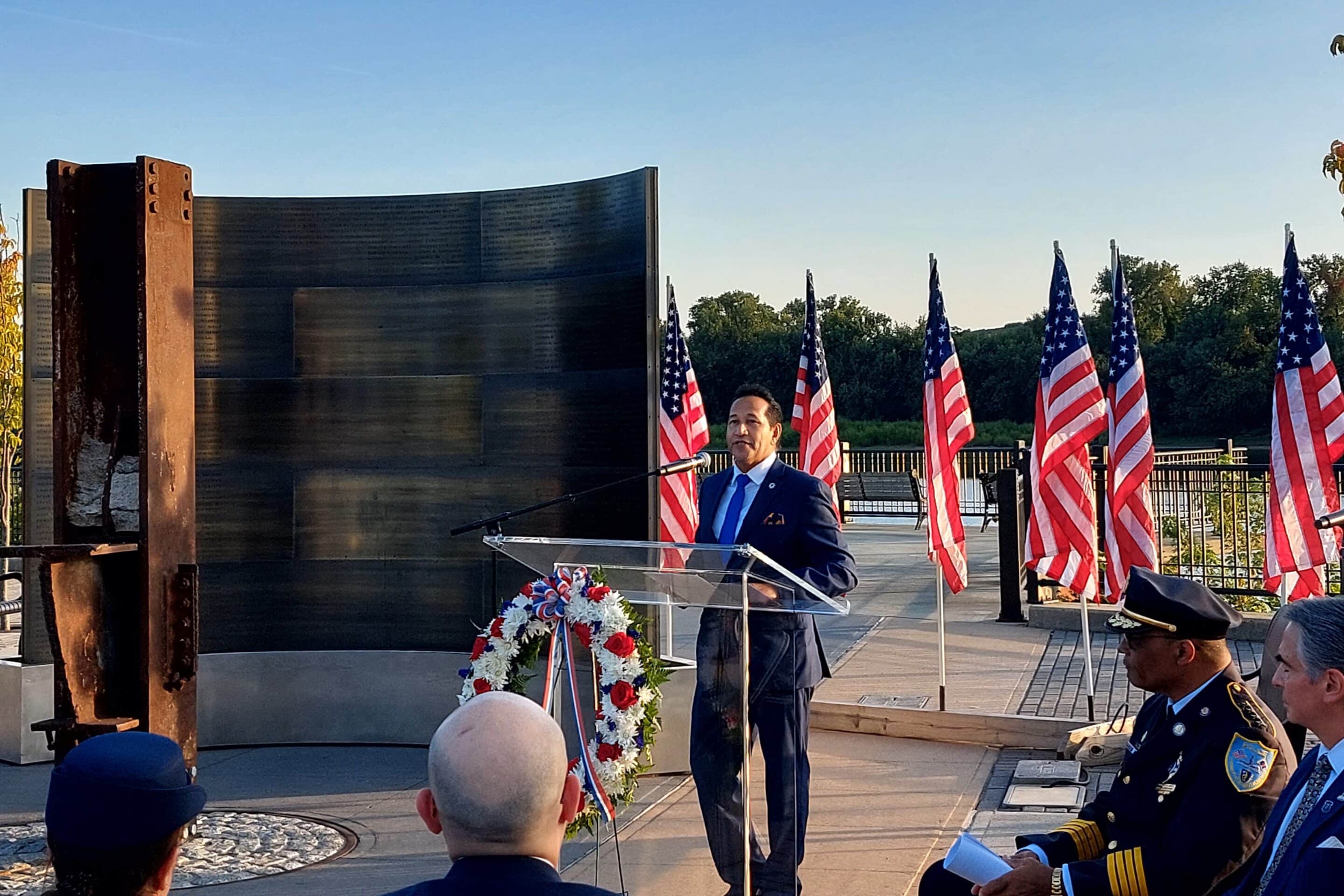 American Medical Response Regional Director Patrick Leonardo reminded those gathered that Springfield “was not untouched by Sept. 11,” and that local people lost loved ones. Referring to the memorial, he said that it “reminds us that, even in the darkest times, we can find light in community.”