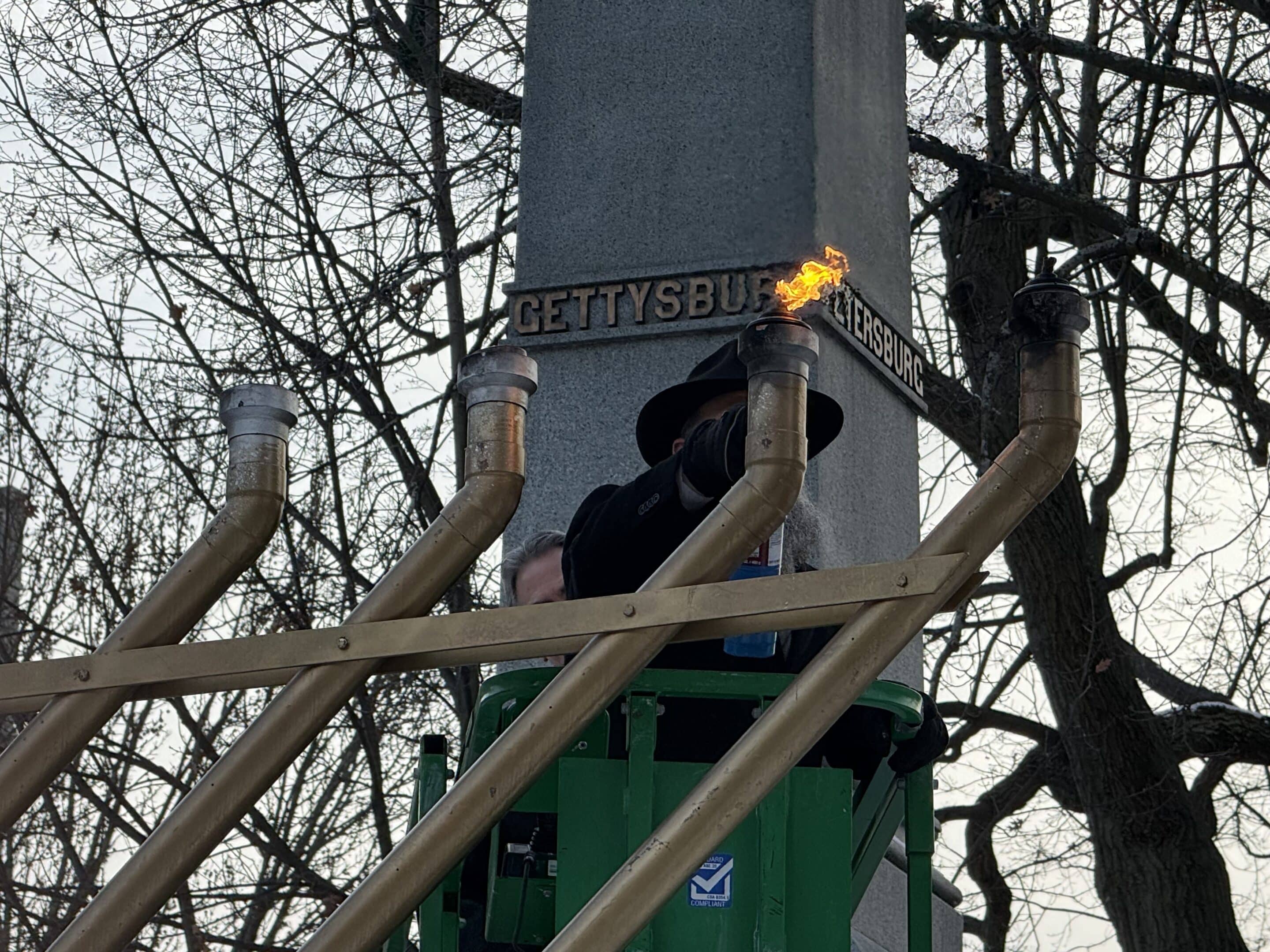Rabbi Noach Kosofsky lights the first and second lamp of the menorah.