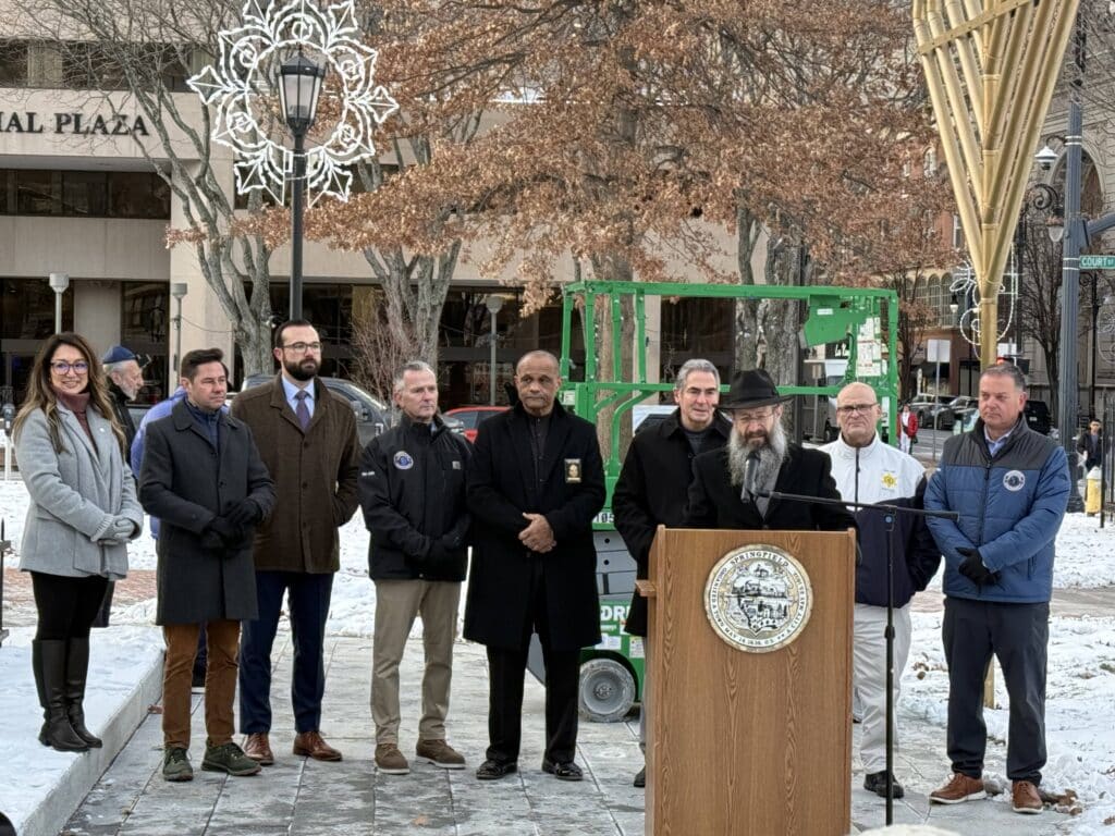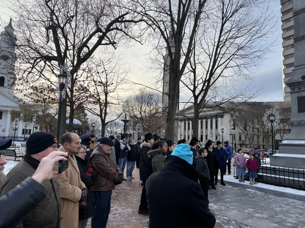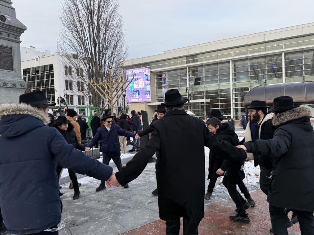 SPRINGFIELD — In Springfield’s Court Square on Dec. 15, the smell of warm Latkes carried through the freezing air as children danced the Hora in anticipation for the annual menorah lighting by Lubavitcher Yeshiva Academy’s Rabbi Noach Kosofsky, marking the beginning of Hanukkah.