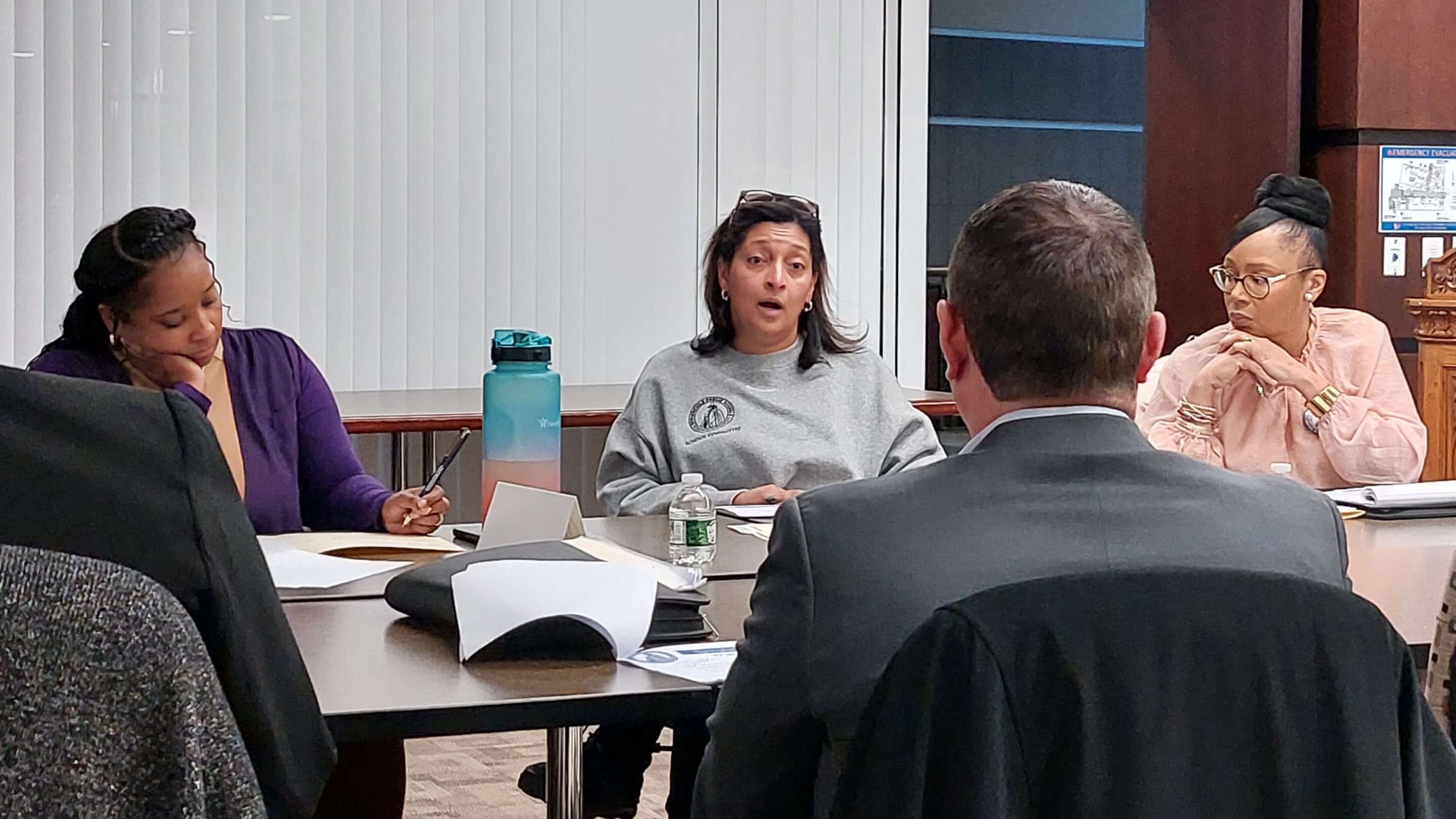 School Committee member Denise Hurst, flanked by colleagues LaTonia Monroe Naylor and Ayana Crawford, asks Chief Financial Officer Patrick Roach questions about the latest budget information at the March 4 Budget and Finance Subcommittee meeting.