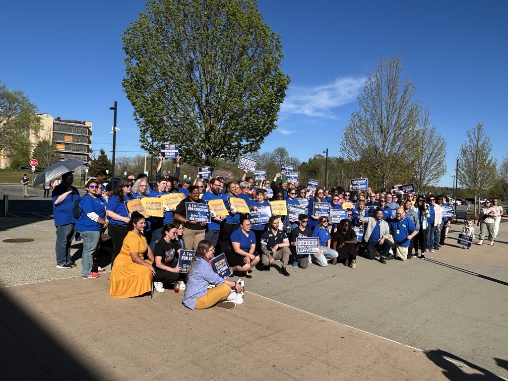A large group of educators and representatives from the Springfield Education Association gathered at Roger L. Putnam Vocational Technical Academy to advocate for a new contract with desirable benefits. The union is currently in negotiations with School Committee representatives after almost 11 months without a contract.