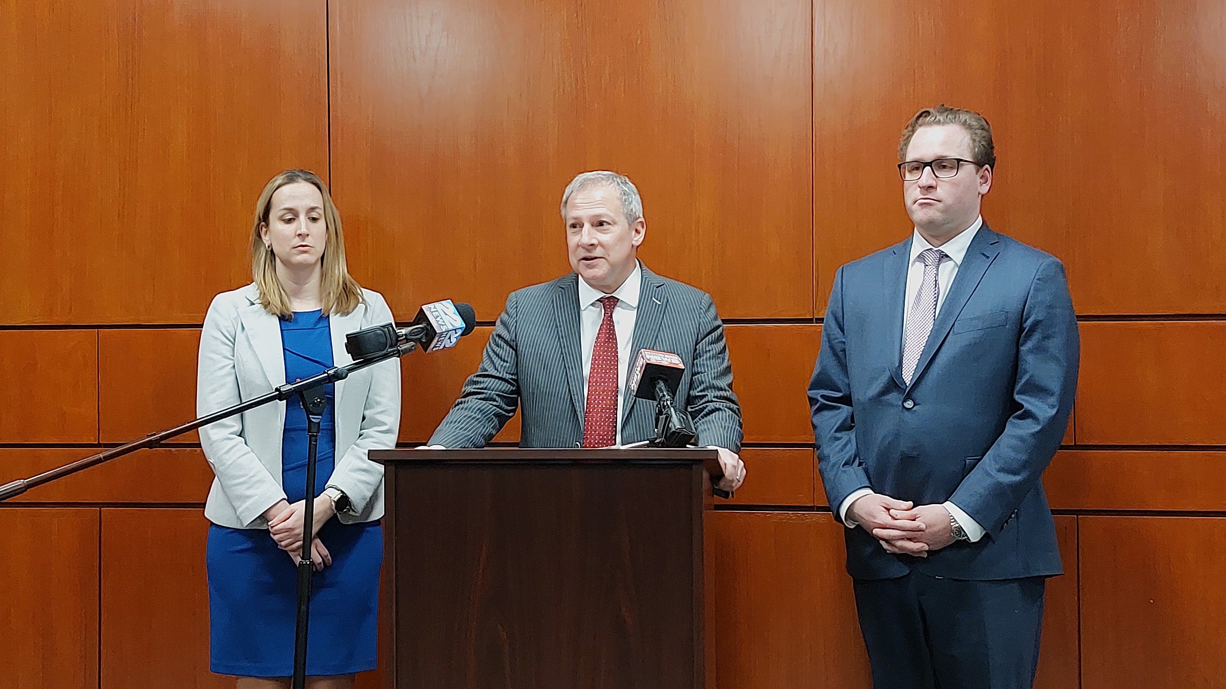 Laura Mangini of Alekman DiTusa and Alexander Sneirson of Sneirson Law Firm flank Alekman DiTusa partner Robert DiTusa as he discusses the settlement of a child sex abuse civil suit.