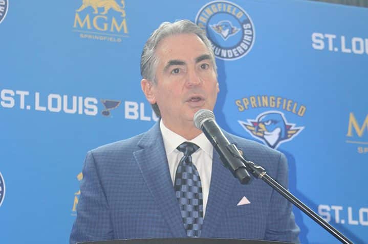 The Springfield Thunderbirds and the NHL’s St. Louis Blues gathered employees, team and public officials, and local luminaries to the MassMutual Center to announce a new agreement that will extend the two franchise’s affiliation through 2031.