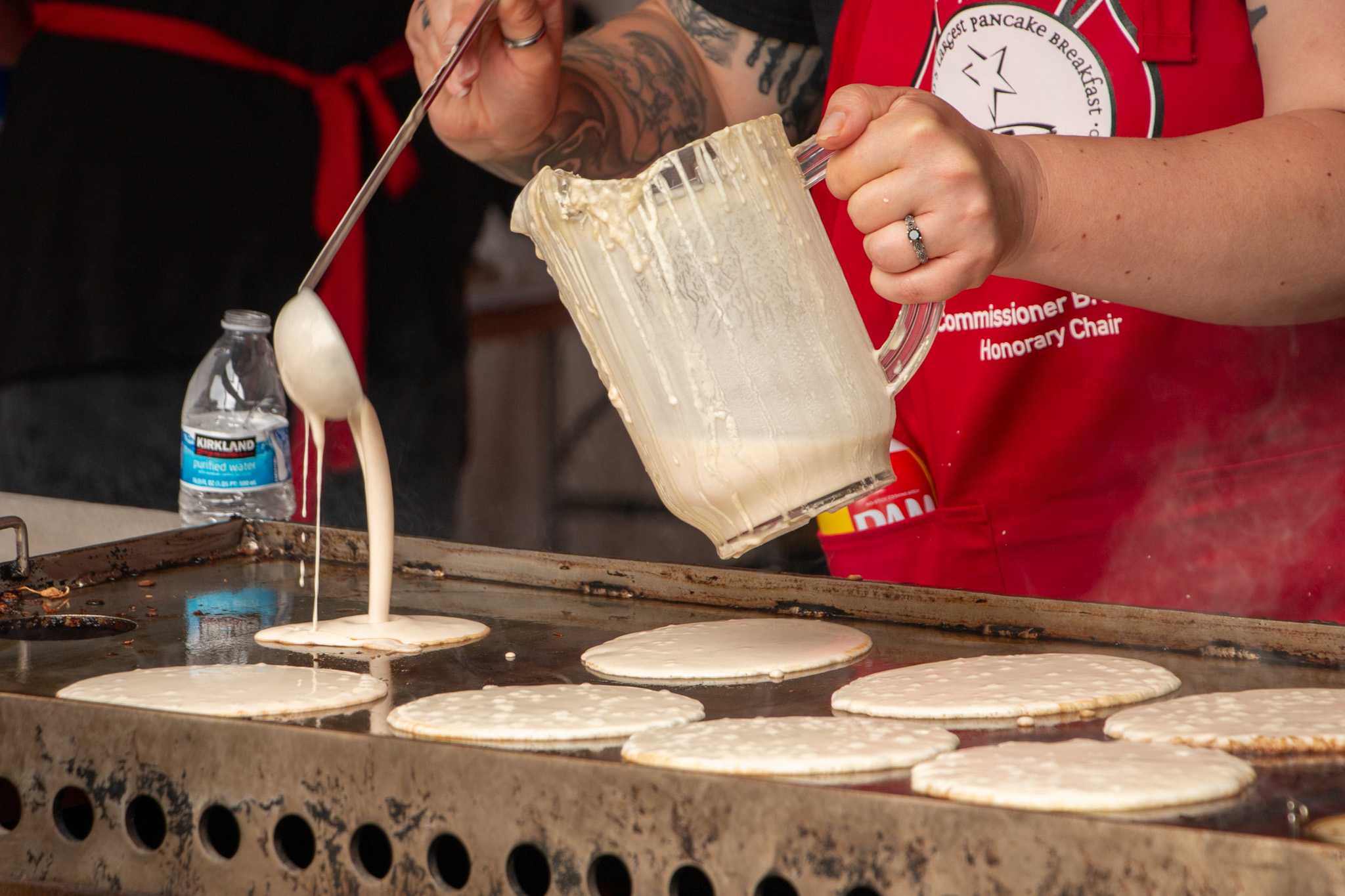 A pancake attendant cooks up fresh pancakes for event goers at this year’s Largest Pancake Breakfast.