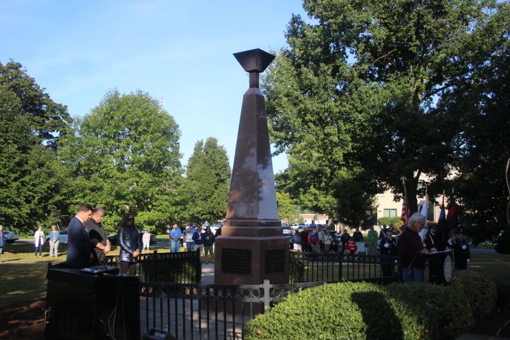 Mayor William Reichelt tells attendees at West Springfield’s annual 9/11 remembrance ceremony to share their stories of the day with the younger generations.
