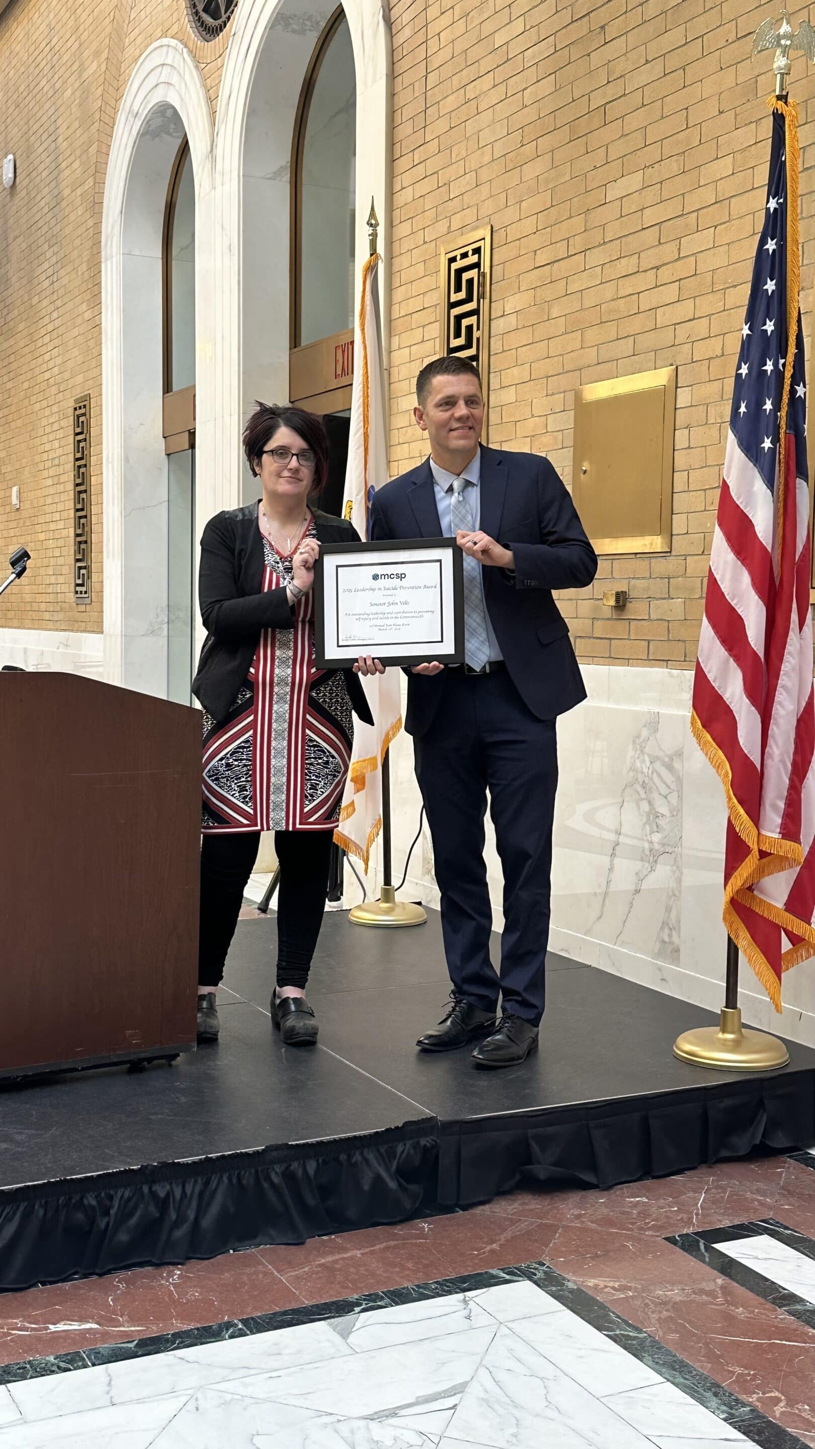 State Sen. John Velis thanked the MA Coalition for Suicide Prevention for the recognition of his leadership in suicide prevention during the March ceremony.