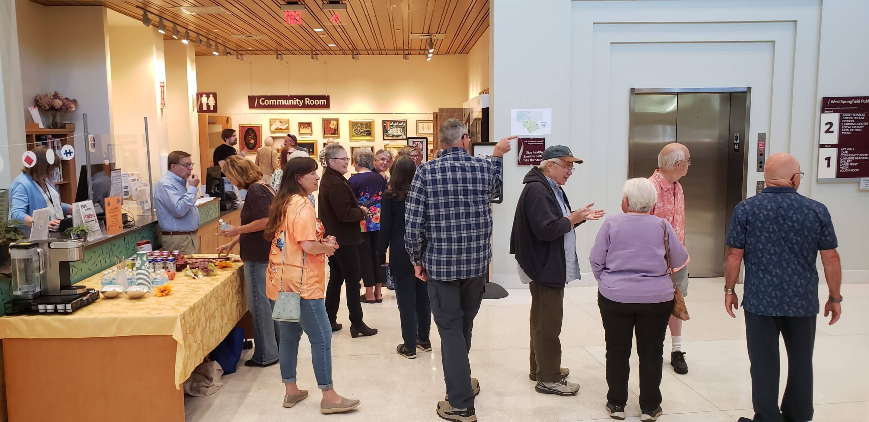 Patrons attend a reception for Jane Barrientos’ work at the West Springfield Public Library on Sept. 10.