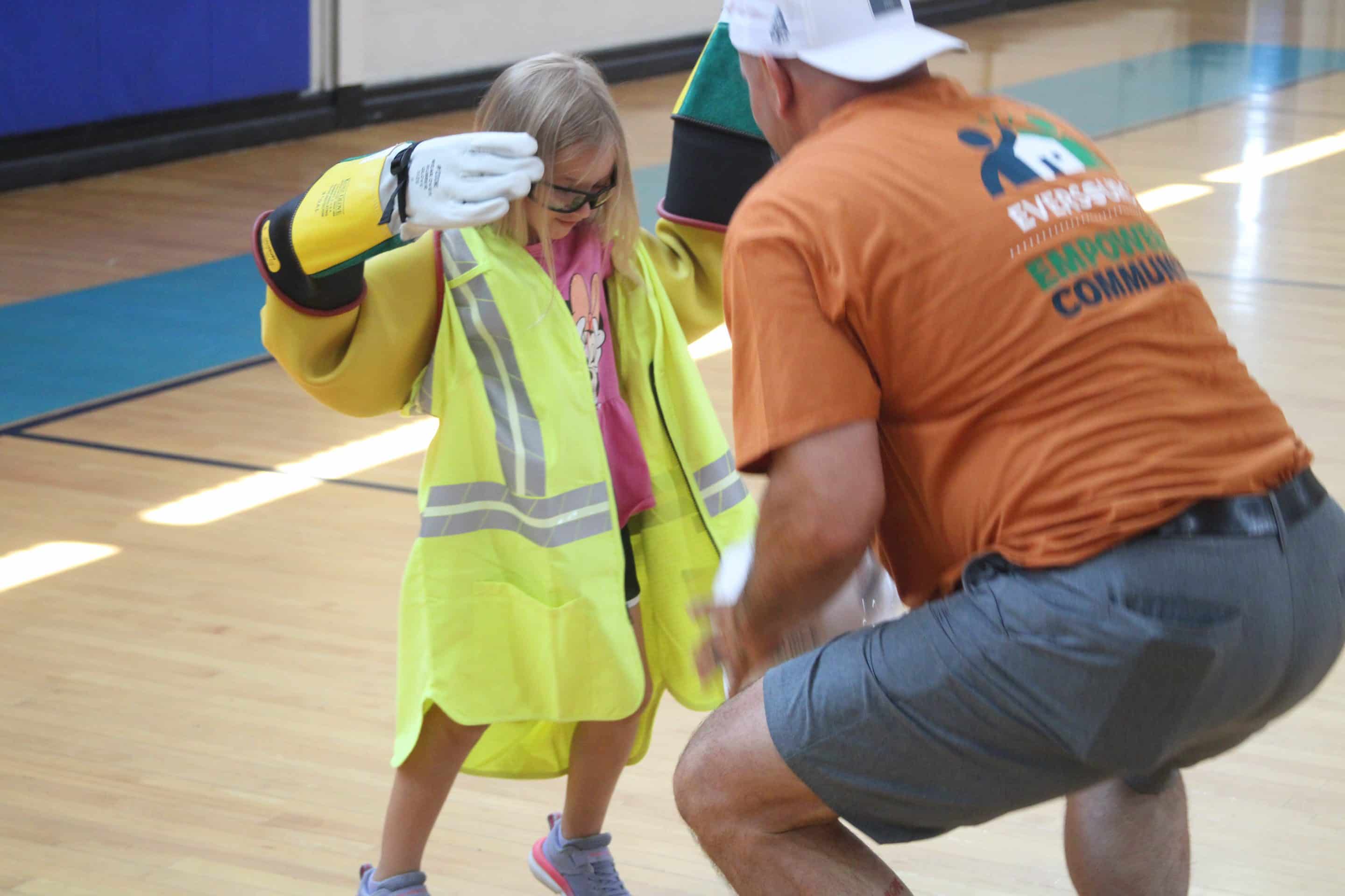 An Eversource employee volunteer helps a child get the company’s lineworker outfit on.