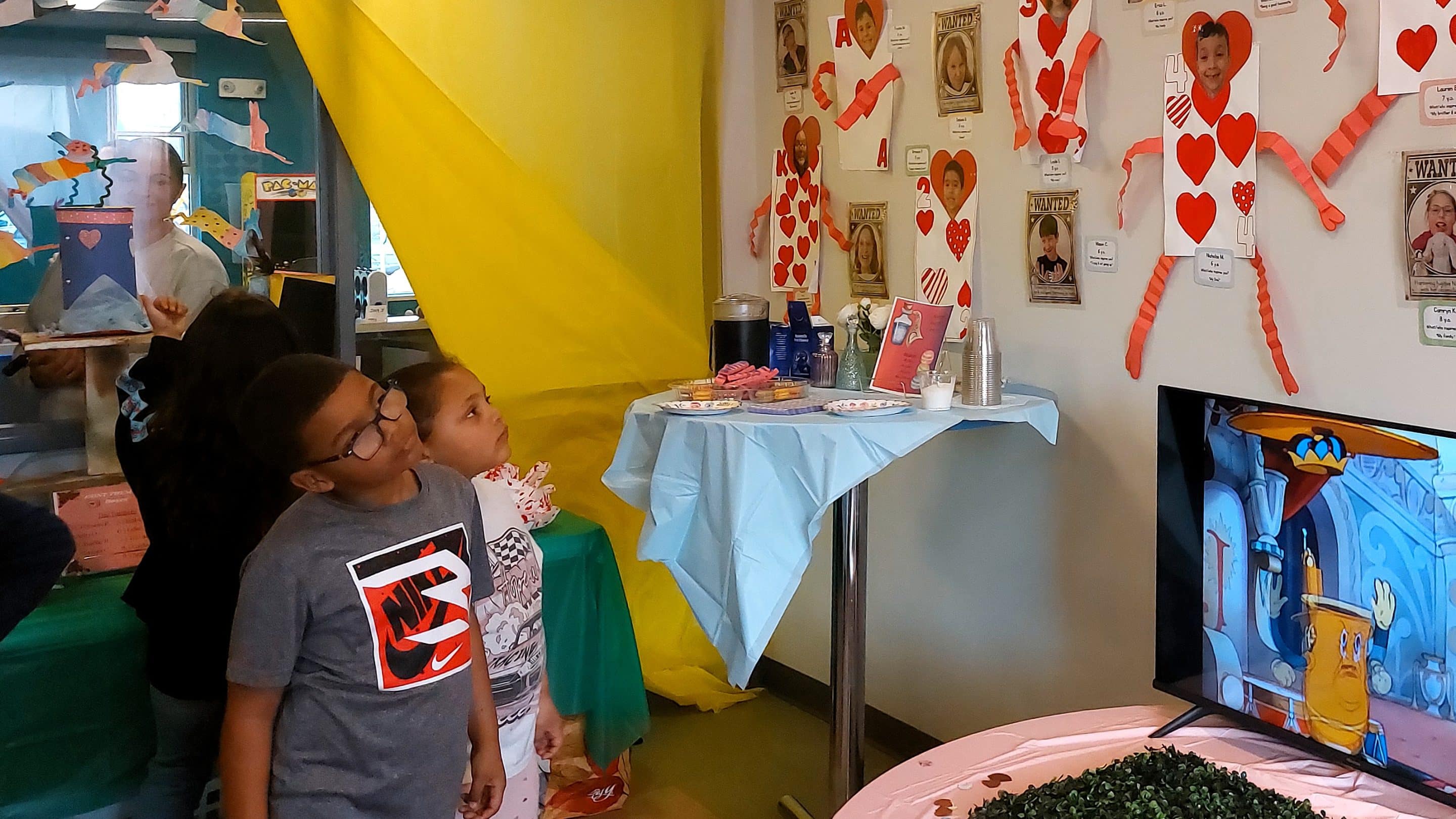 Aniya Holbrook and Mahamad Holbrook look at playing-card people in the “Springtime in Wonderland” room.