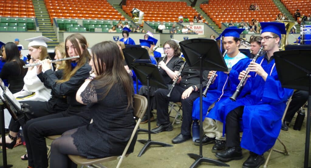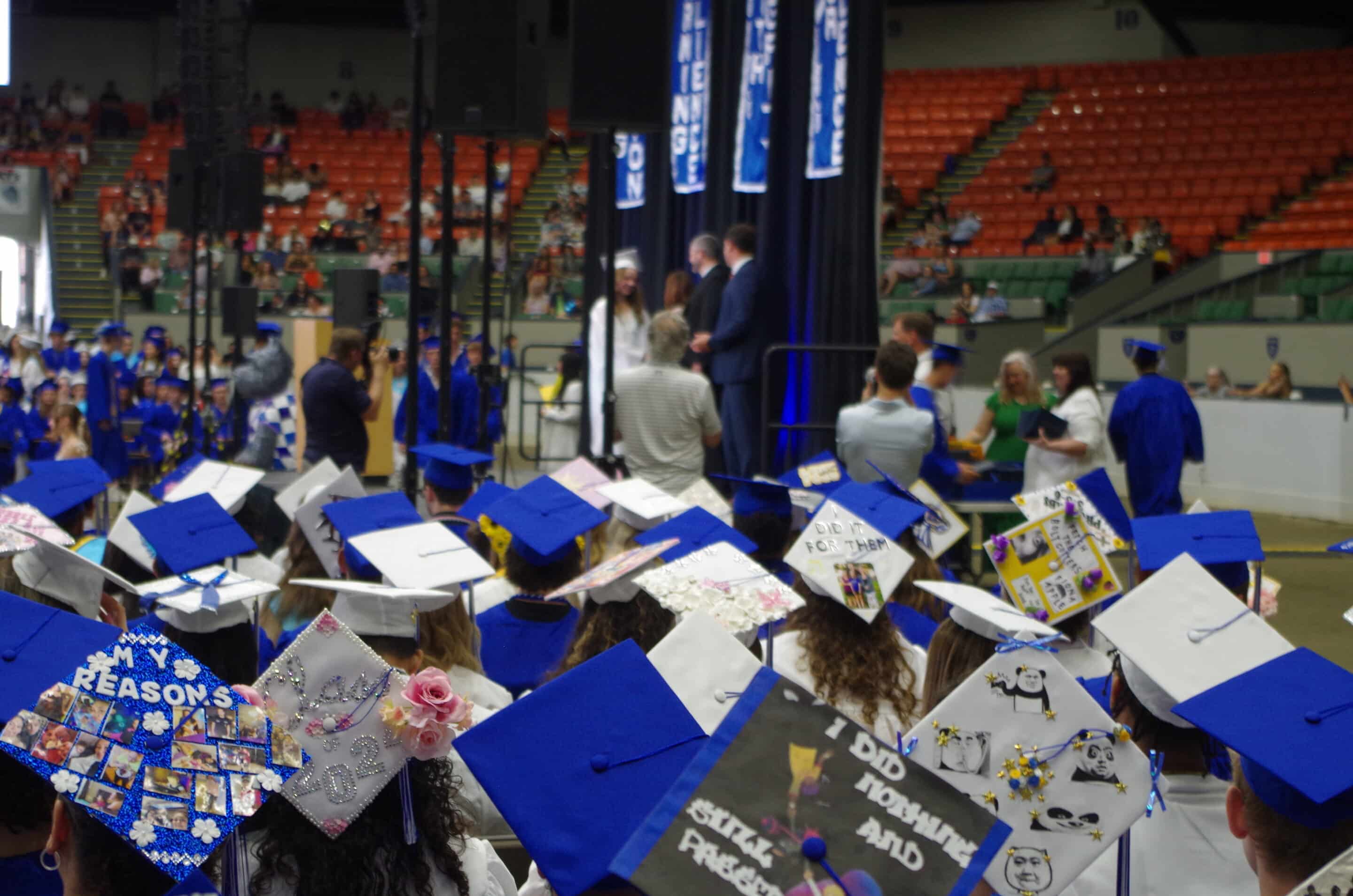 West Springfield High School graduates, many of whom had decorated their mortarboards, watch as their classmates receive diplomas on June 2 at the Eastern States Coliseum.