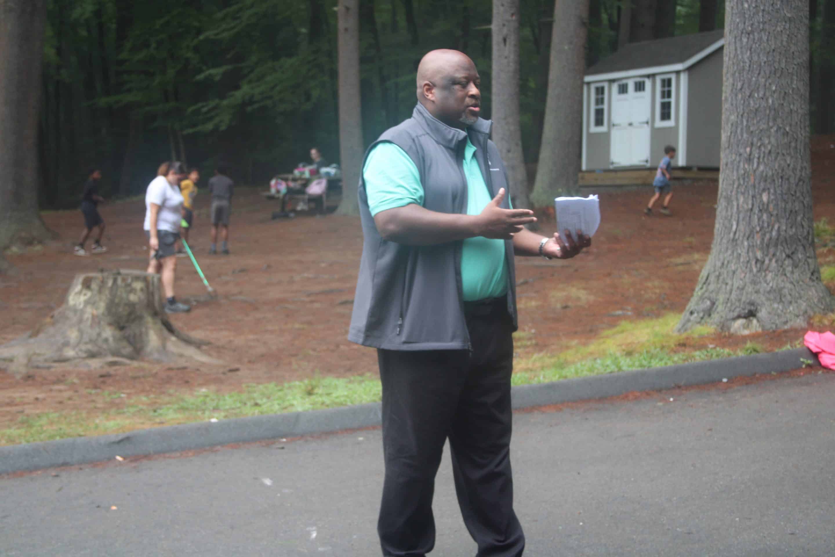 Dexter Johnson, president of YMCA of Greater Springfield, thanks volunteers for their work preparing summer campgrounds in West Springfield and Wilbraham as children play in the background.