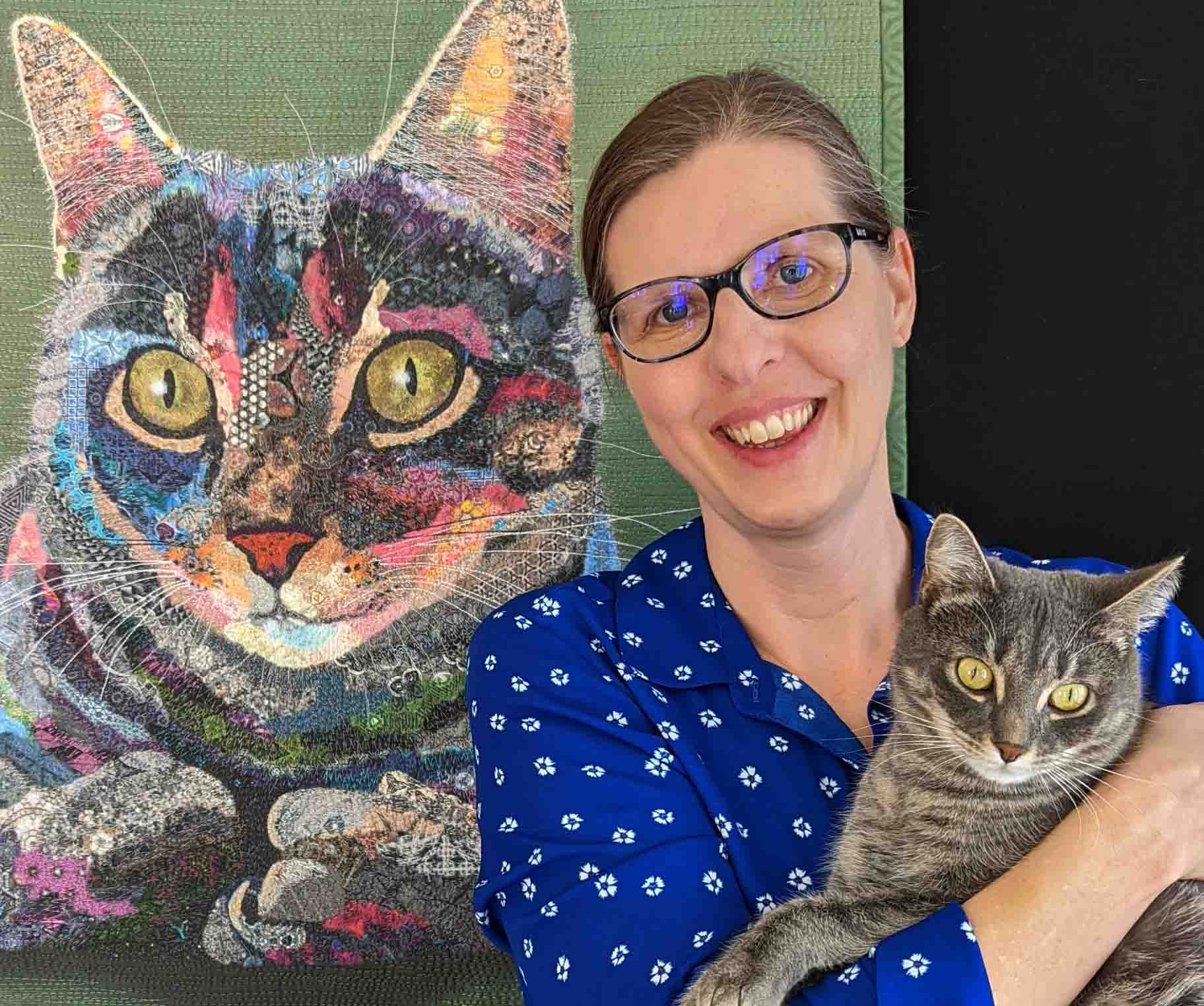 “I feel like at first, I wanted my art to be separate, so I had variety in my life. But now that I create fiber art animal portraits, I really feel a passion for it,” said Allen. “Recently, I wrote and illustrated a children’s book, ‘Pink Mouse in My House.’ It is full of cats, and one toy mouse. I felt happy every day, drawing lots of cats! Now I am working on illustrating the next book, which is hilarious and fun, about a cat who is panicking about the new puppy giving him fleas.”