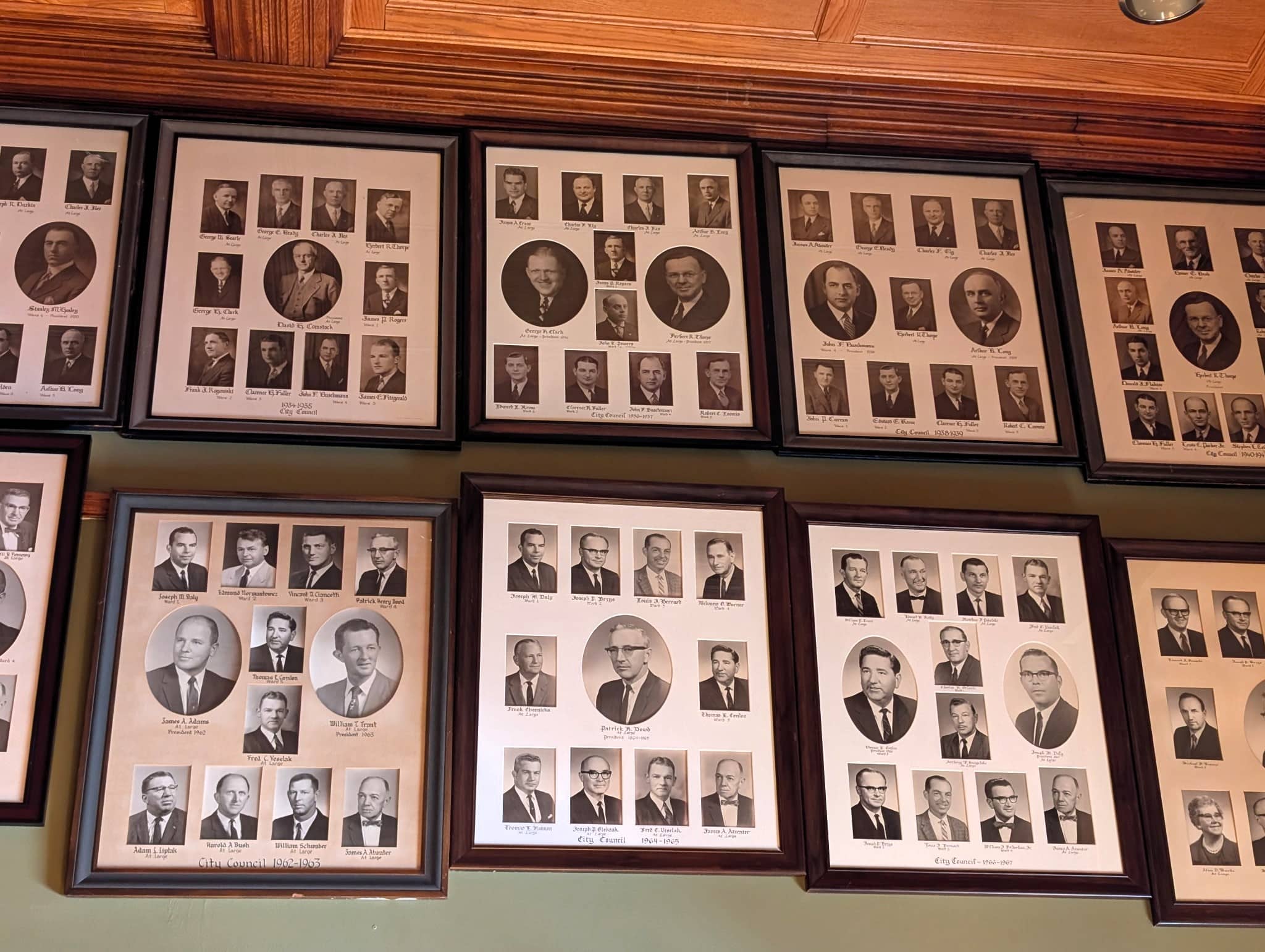Westfield City Council portraits in Council Chambers; some of which will be reframed to make room for more.