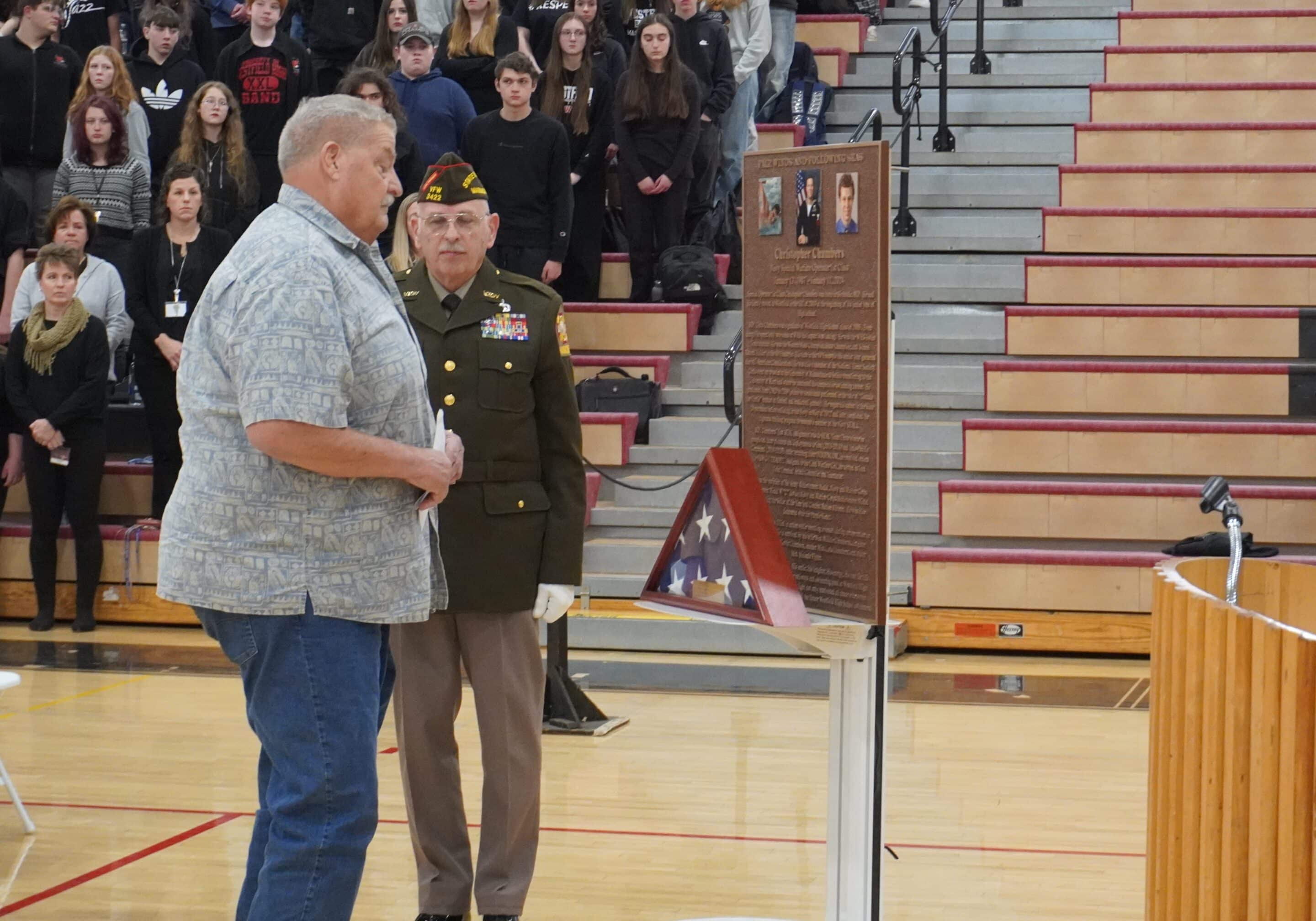 Kevin Chambers, the father of Christopher Chambers, stands in front of the plaque that will honor his son moments after it is unveiled.