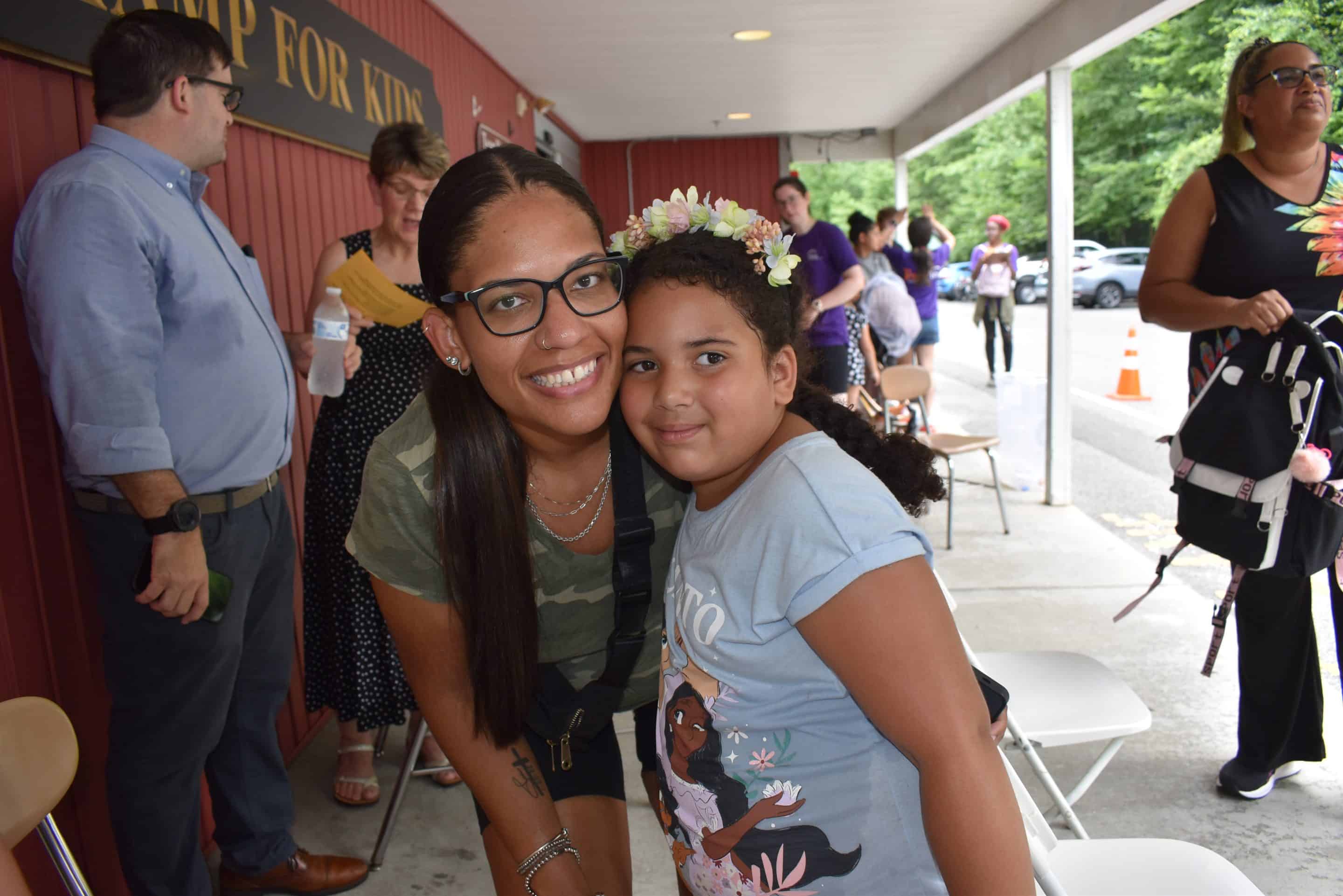 Visiting parent Georgina Nunez shares a smile with her son’s friend Nyla Sanchez at Kamp for Kids Welcome Day on July 12.