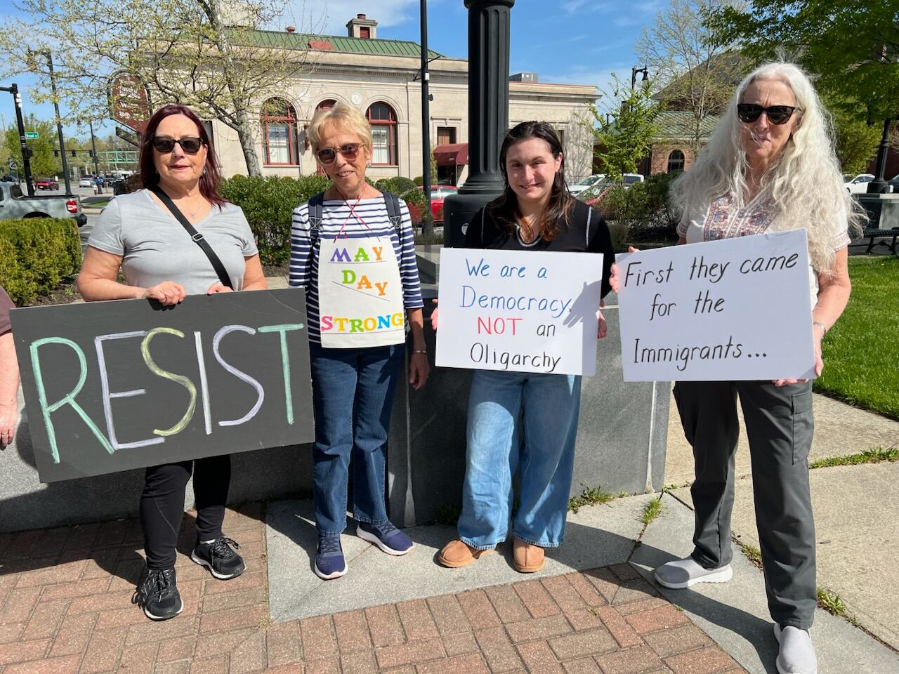WESTFIELD — Over 100 area residents showed up for a May Day protest at Park Square Green, holding signs that read “Defend Democracy,” “Hands off Libraries, Unions, Schools” and “Resist.”