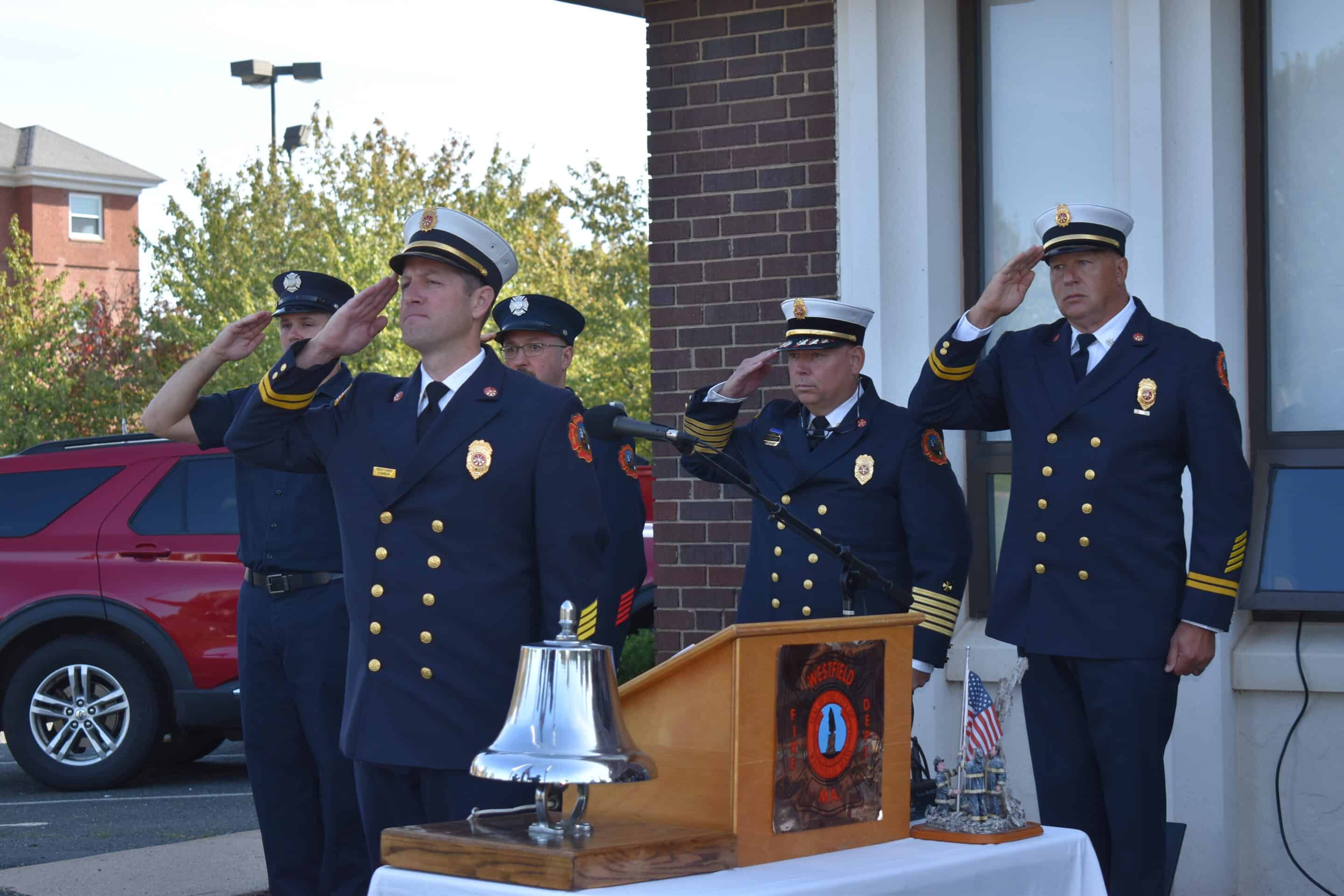Deputy Chief Patrick Kane, Jr. and Deputy Chief Eric Bishop led the lowering of the flag to half mast, a moment of silence, prayers, poems, “Amazing Grace” played by Firefighter Roger Bernier on the bagpipes, followed by the tapping out of four 5’s on the bell.