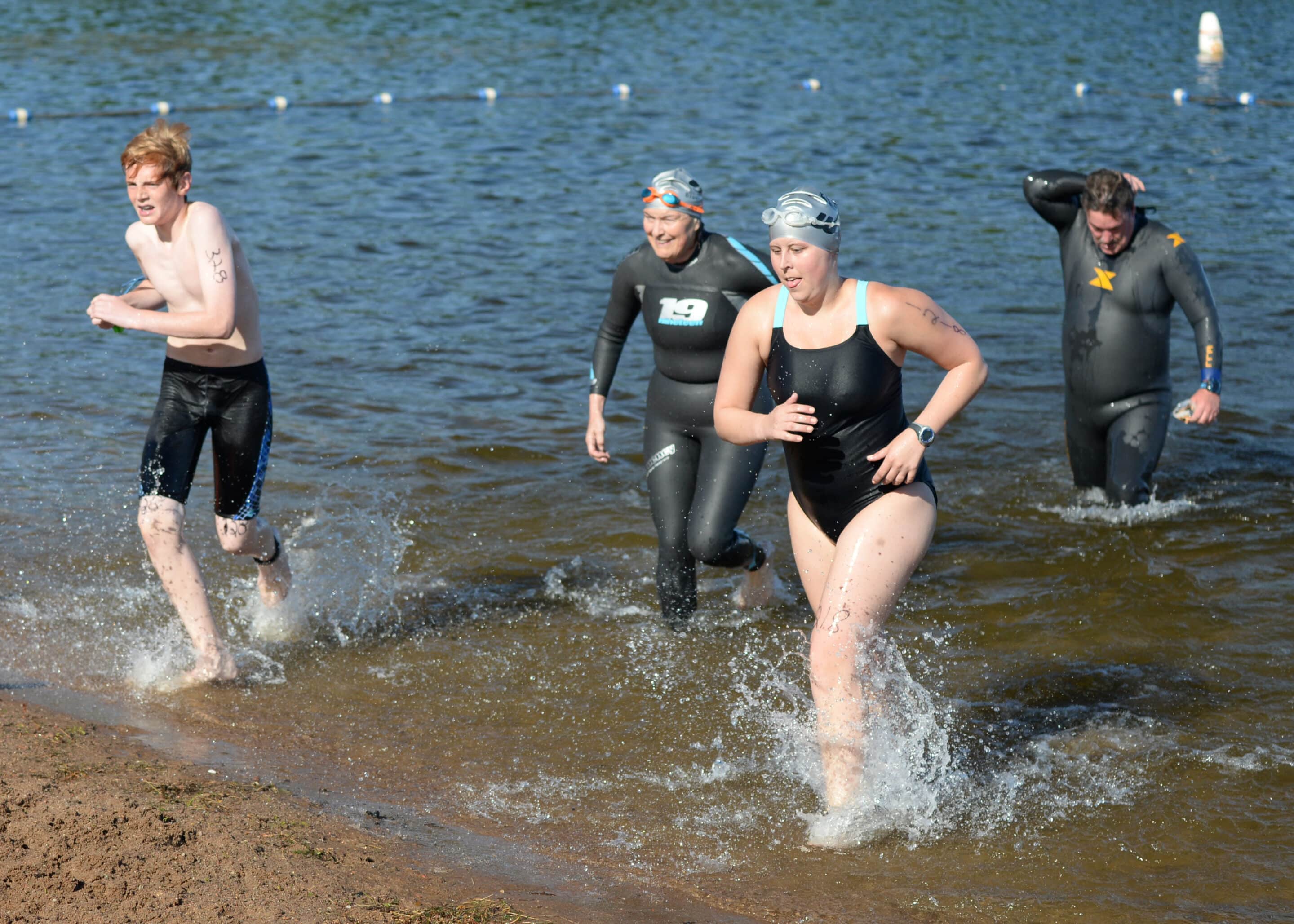 Competitors arrive on shore as they move to the next phase of the triathlon. Swimmers line up at a previous Tri for Jimmy.