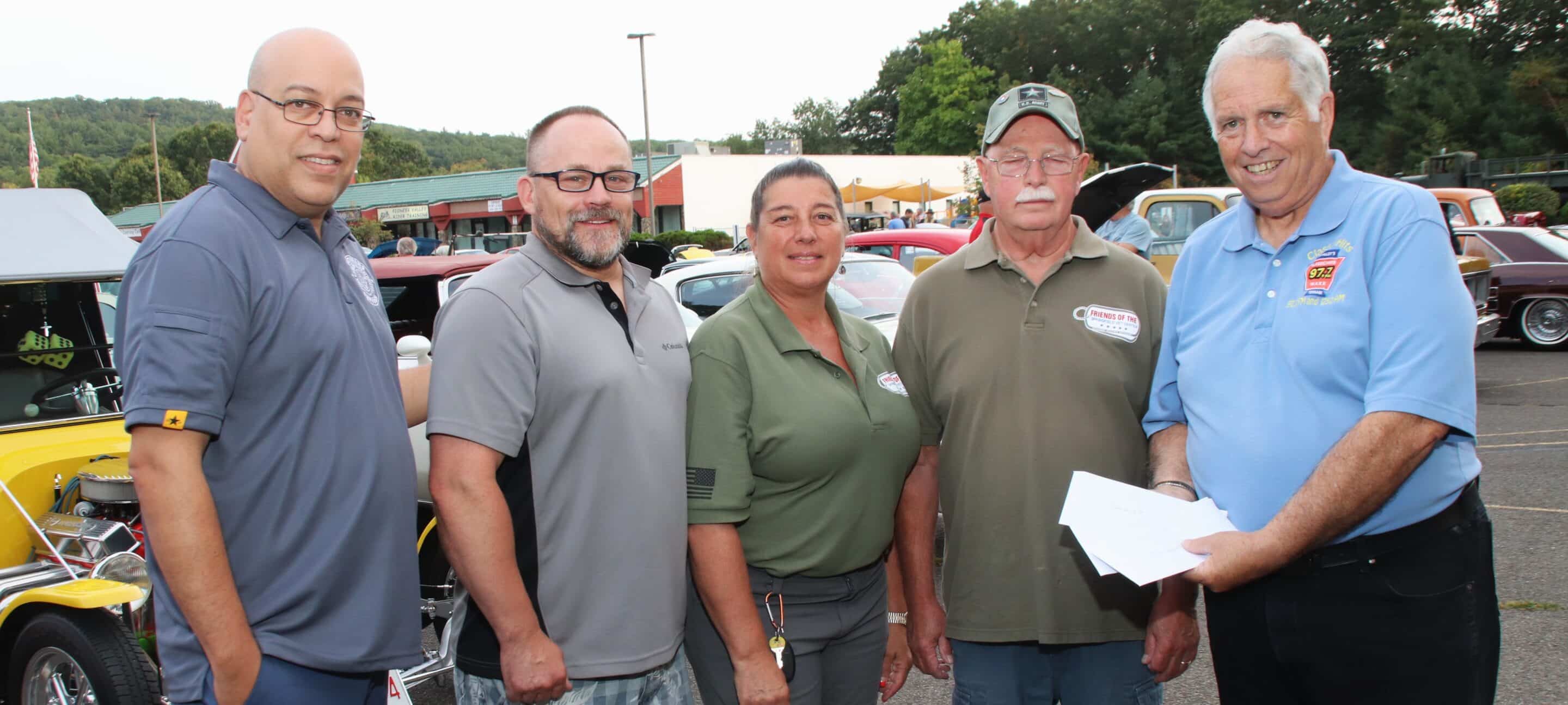Representatives of three local veterans group received donations from Bruce Marshall, far right, at his final cruise night at Hampton Ponds Plaza. From left are Ludlow Veterans Agent Eric Segundo, Steve Jones of Warrior’s Art Room and Tiffany Jones and Arlyn Wyman from Friends of the Springfield Vet Center.