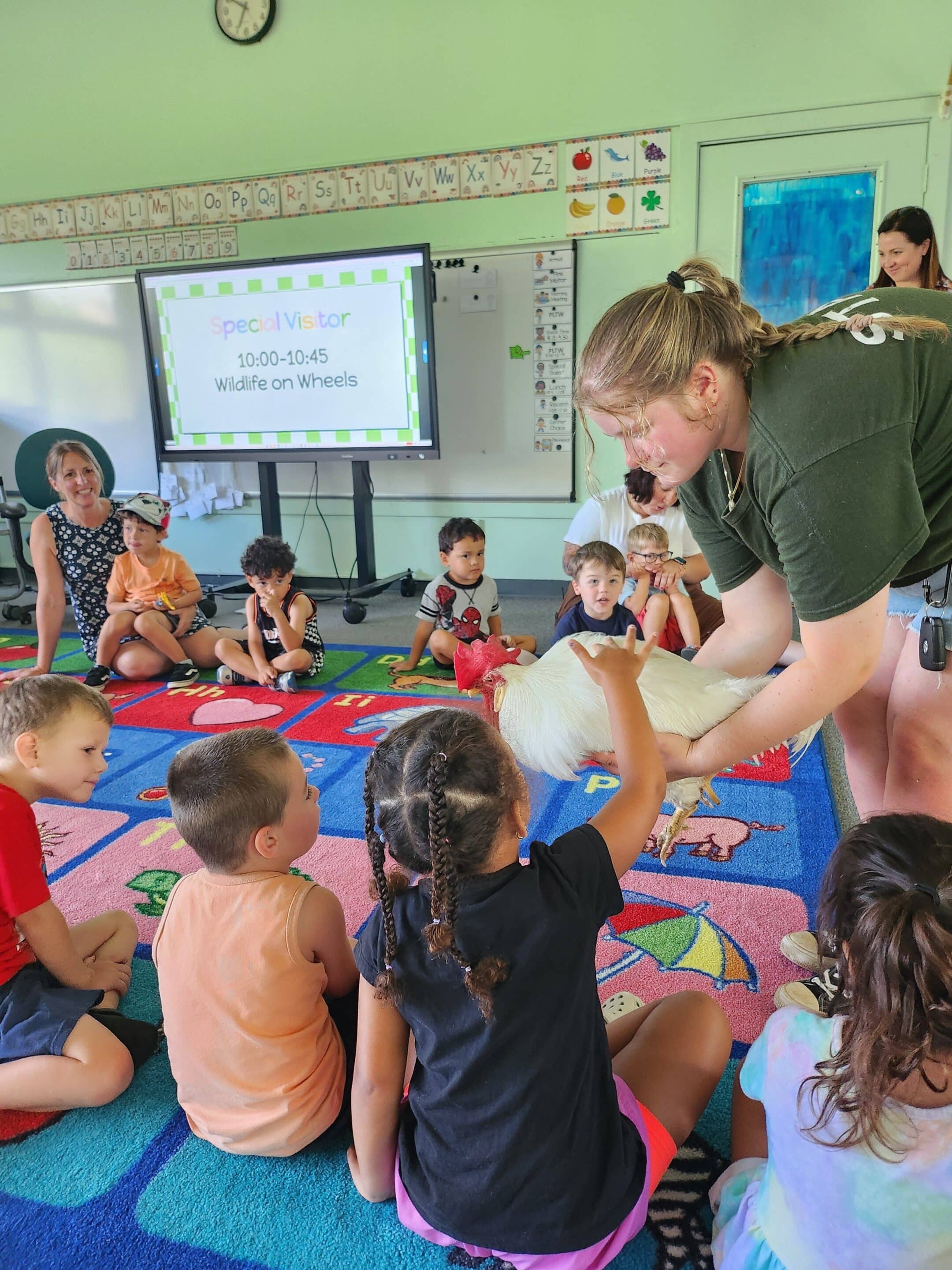 A Forest Park Wildlife on Wheels handler lets preschoolers at summer camp in Highland Elementary School pet a friendly rooster.