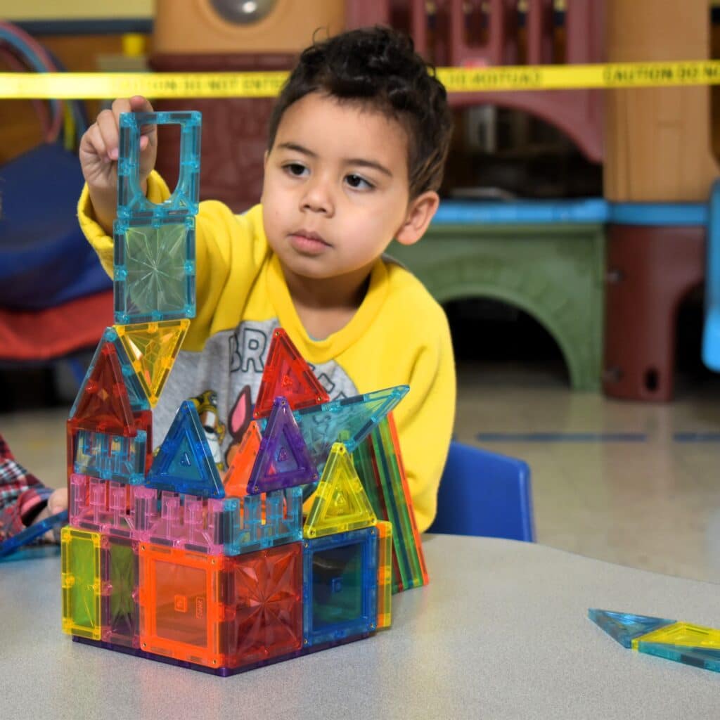 At other stations, Aubrey Wilson helped the 3-year-olds follow a path to put their animal puppets back in a mitten, and Kylie Hevey helped students to build a home for a gingerbread baby out of magnatiles.