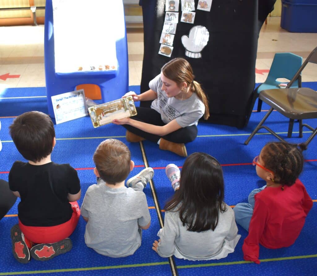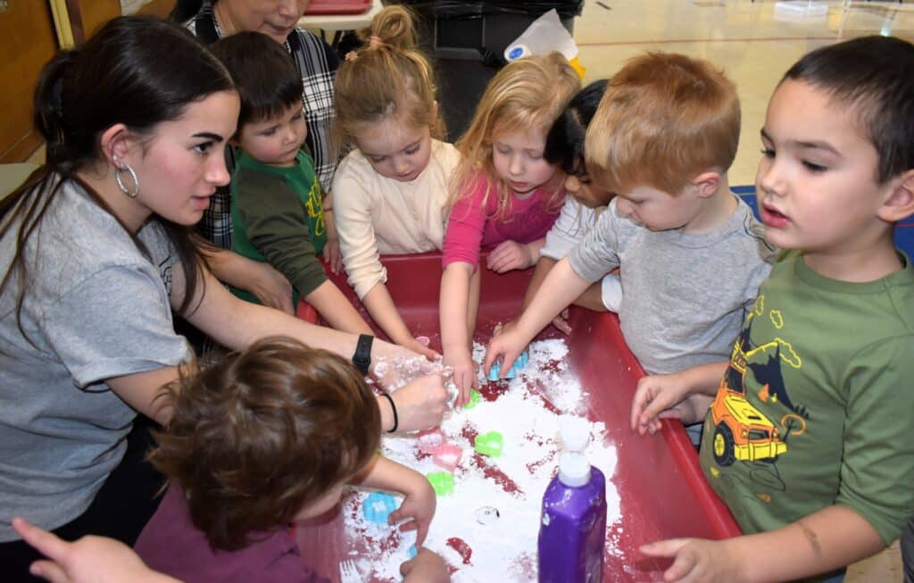 The stations all had plenty of excitement for the students. Sophomore Molly Boisseau read “The Mitten,” and had the students vote on which animal goes in the mitten first. In Snowy Shapes, Keira McArdle mixed together baking soda and conditioner to create “snow,” which the preschoolers then made shapes out of with cookie cutters.