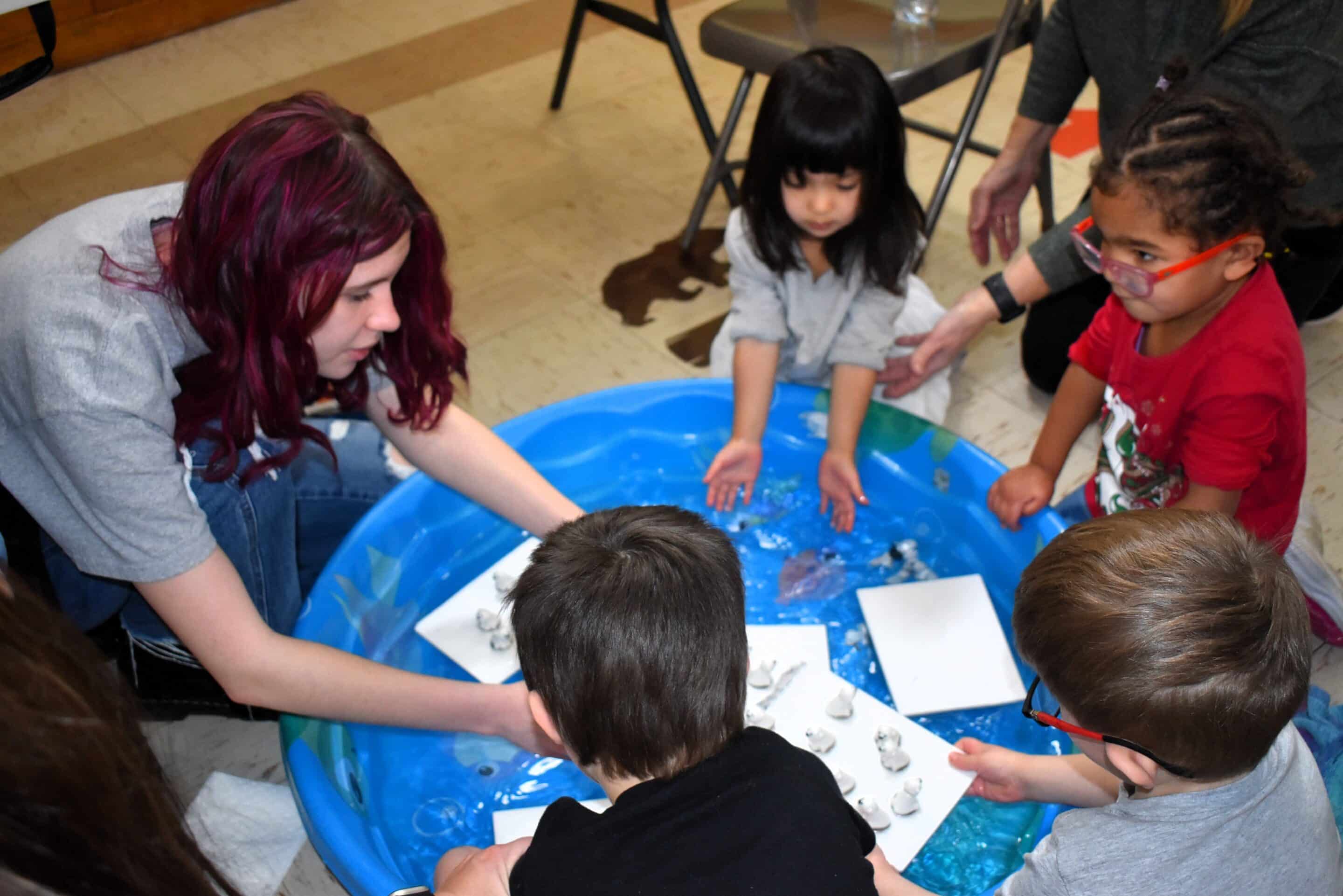Westfield High School sophomore Taylor King helps preschoolers balance polar bears on ice floes in a counting game.