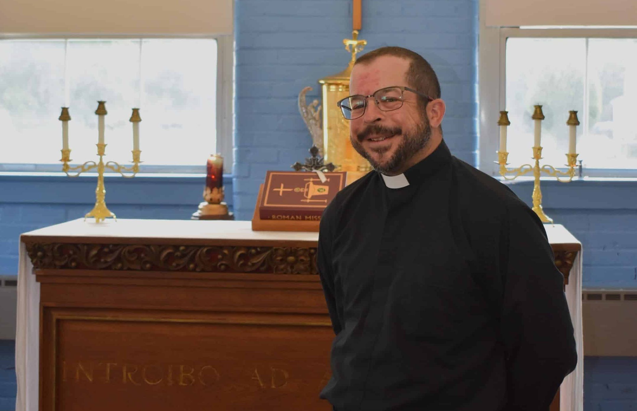 The Rev. Jonathan Reardon, the new pastor of St. Mary’s, Holy Trinity and St. Peter and St. Casimir parishes in Westfield, stands in the Blessed Stanley Rother Chapel at St. Mary’s High School.