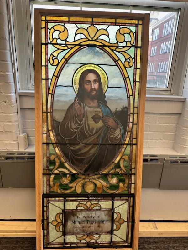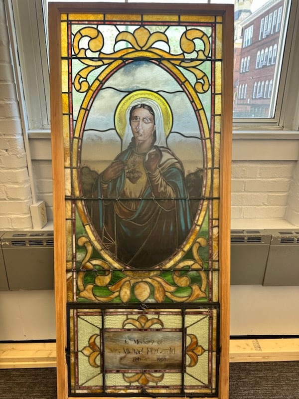 The 1905 stained glass windows depicting the Sacred Heart of Jesus and the Blessed Mother, St. Mary, are now at a restoration workshop being cleaned and repainted in areas that have faded. The restoration is being done by Guarducci Stained Glass Restorations of Great Barrington for $6,300, which Reardon said is a good price for very large windows.