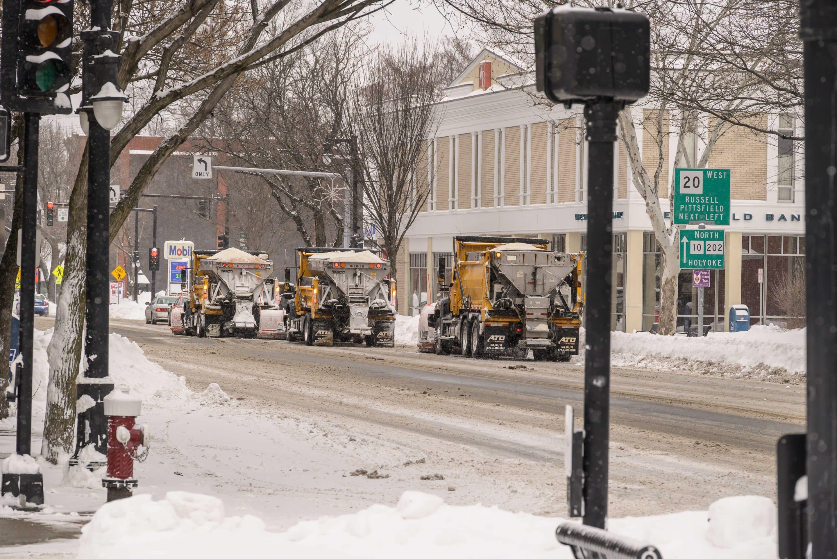 Westfield DPW trucks line up on their way to clear streets during a snow event this past winter.
