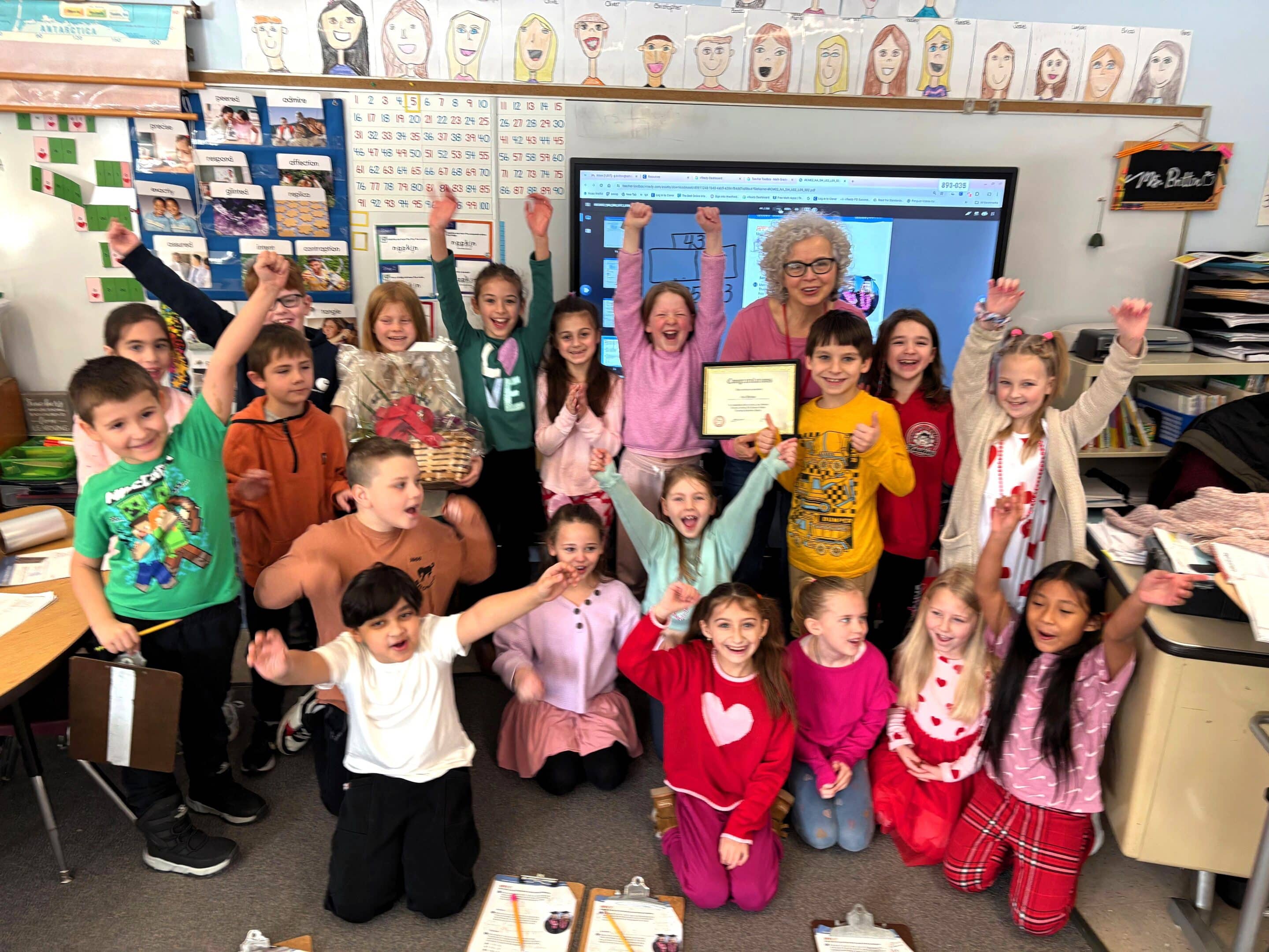 Highland Elementary second graders cheer for their teacher Gail Britton after she received the Grinspoon Excellence in Teaching Award on Feb. 14.