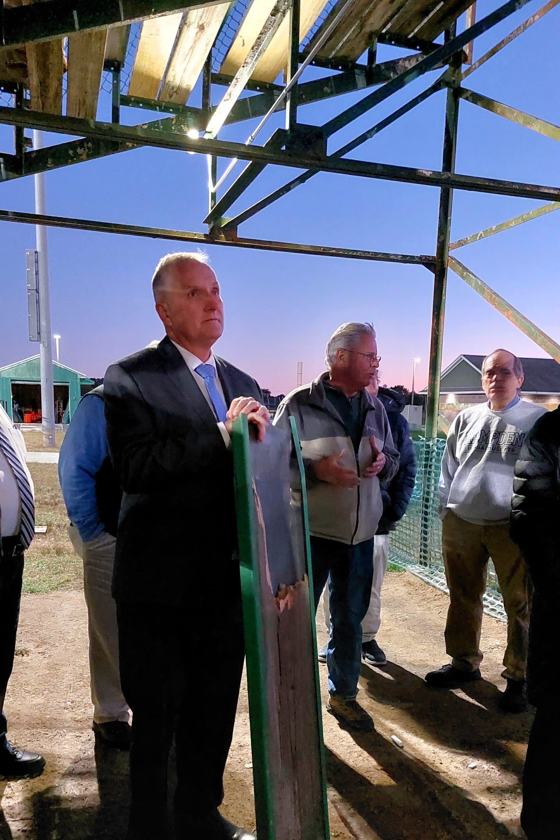 The meeting began with a field trip to the bleachers, during which the board and committee members walked under the structure while a game was happening, and fans were in the stands.